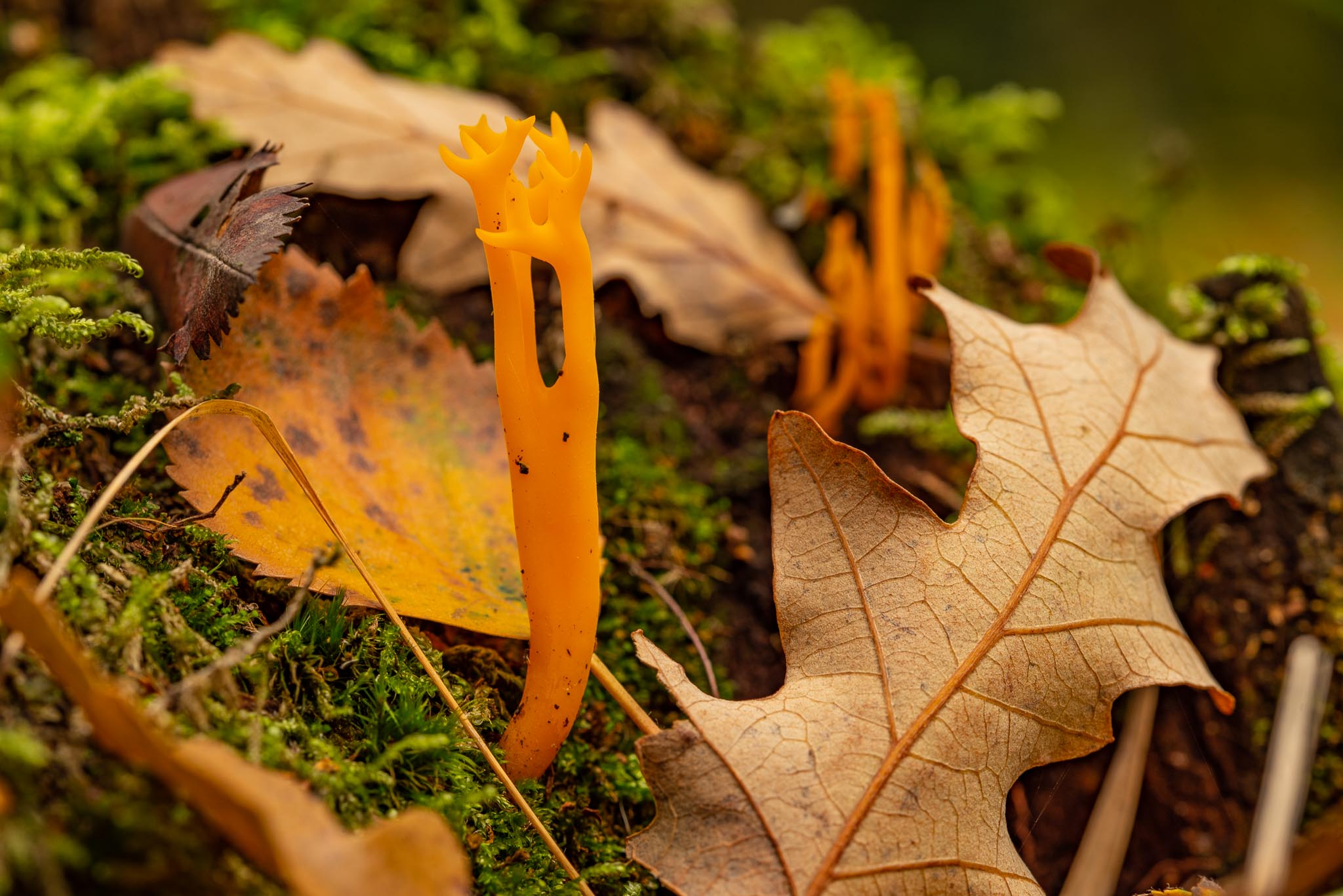 A similar type of fungus was this yellow staghorn, a common species. It was growing down on a mossed-over stump on the woodland floor. That oak leaf on the right (I think Turkey oak, Quercus cerris) is so beautiful.