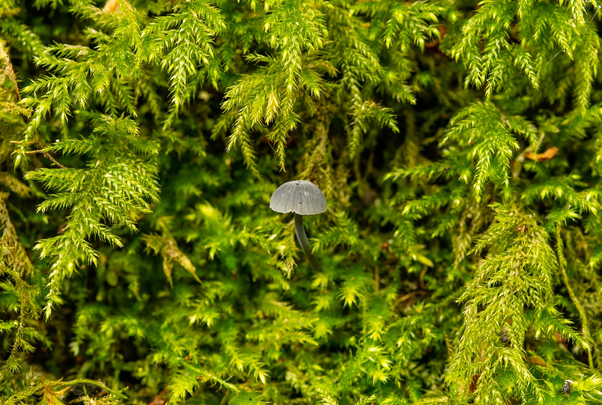 This beautiful little grey-blue mushroom epitomises the mossy shroomlet. As you can see from the moss fronds, it was very small indeed.