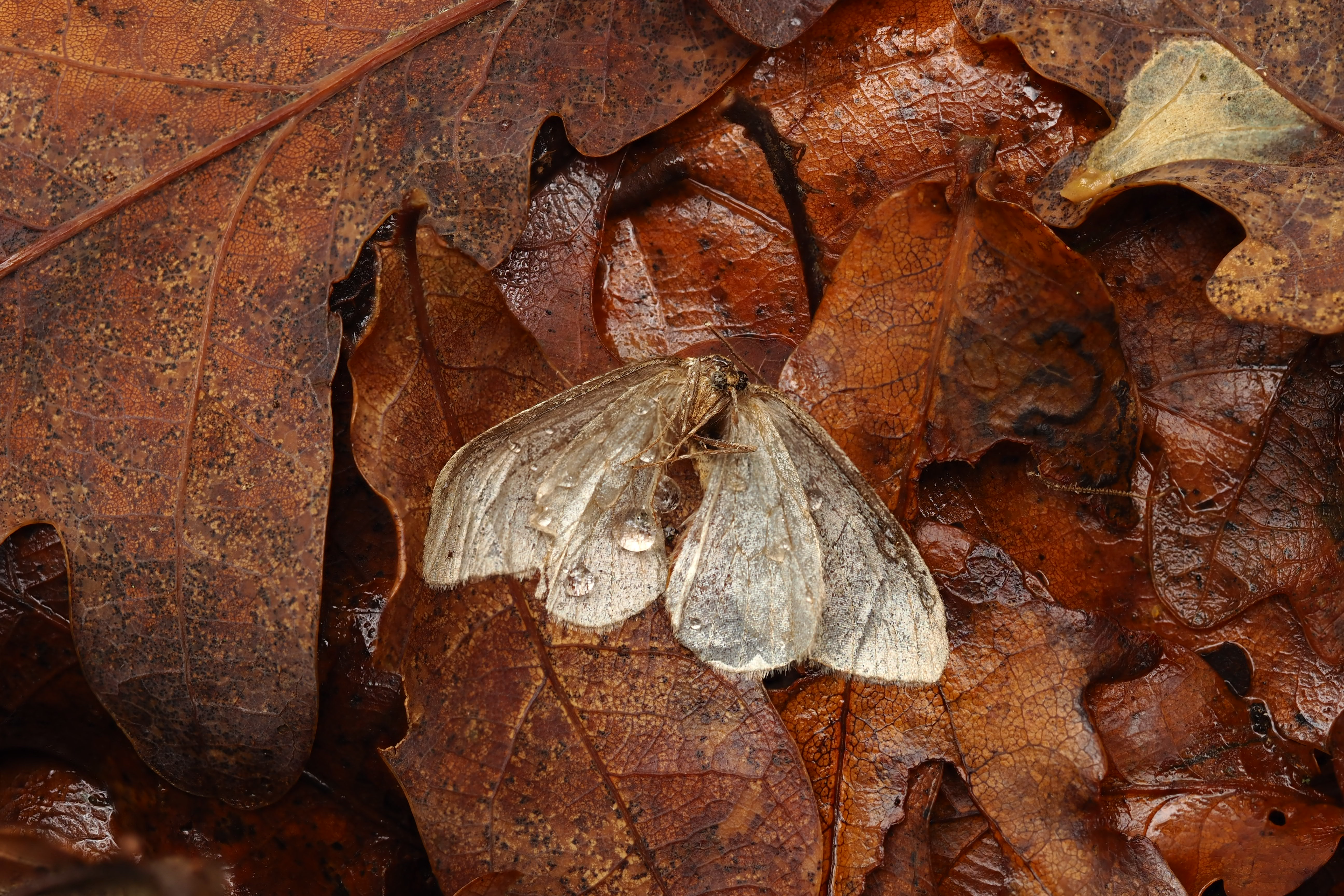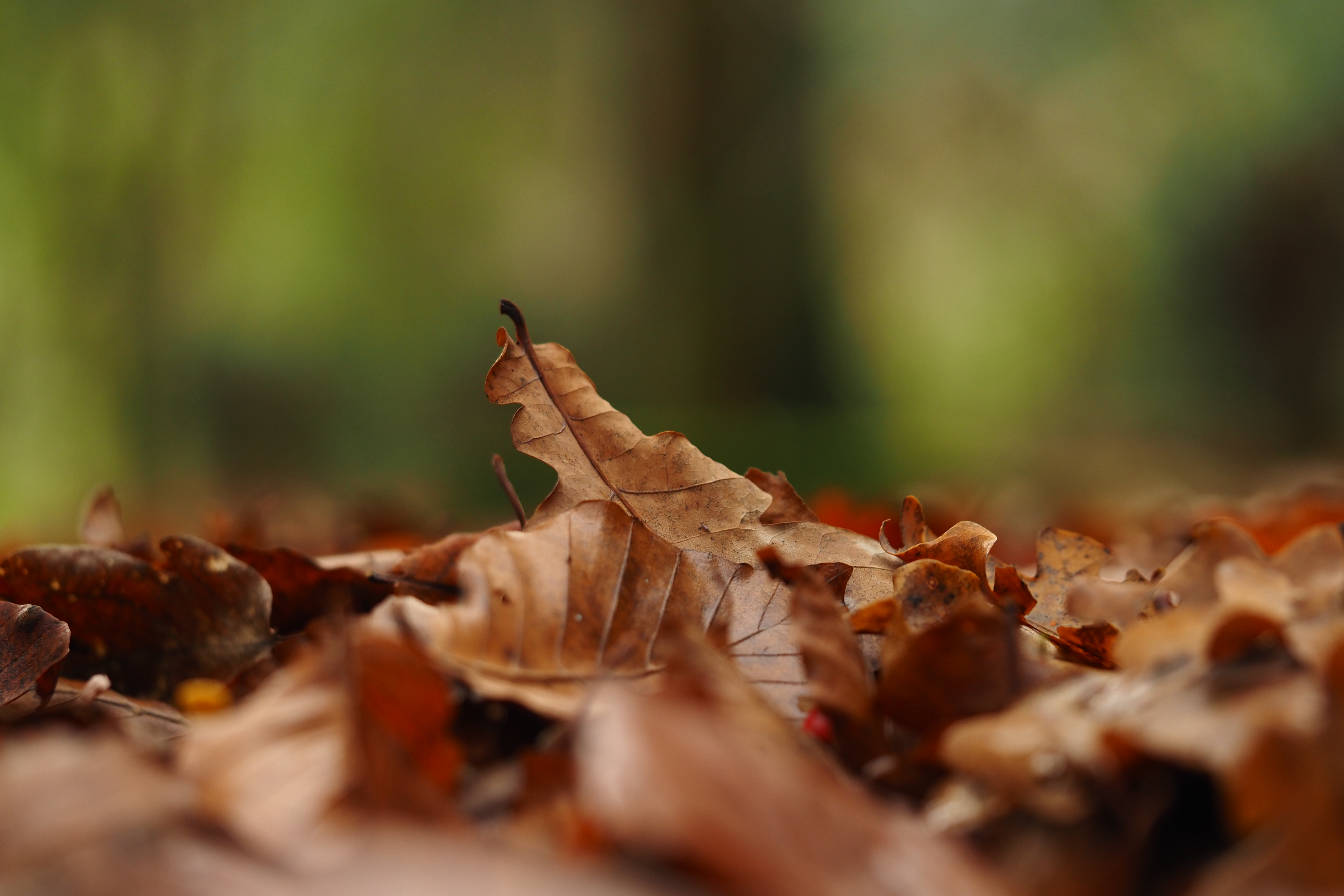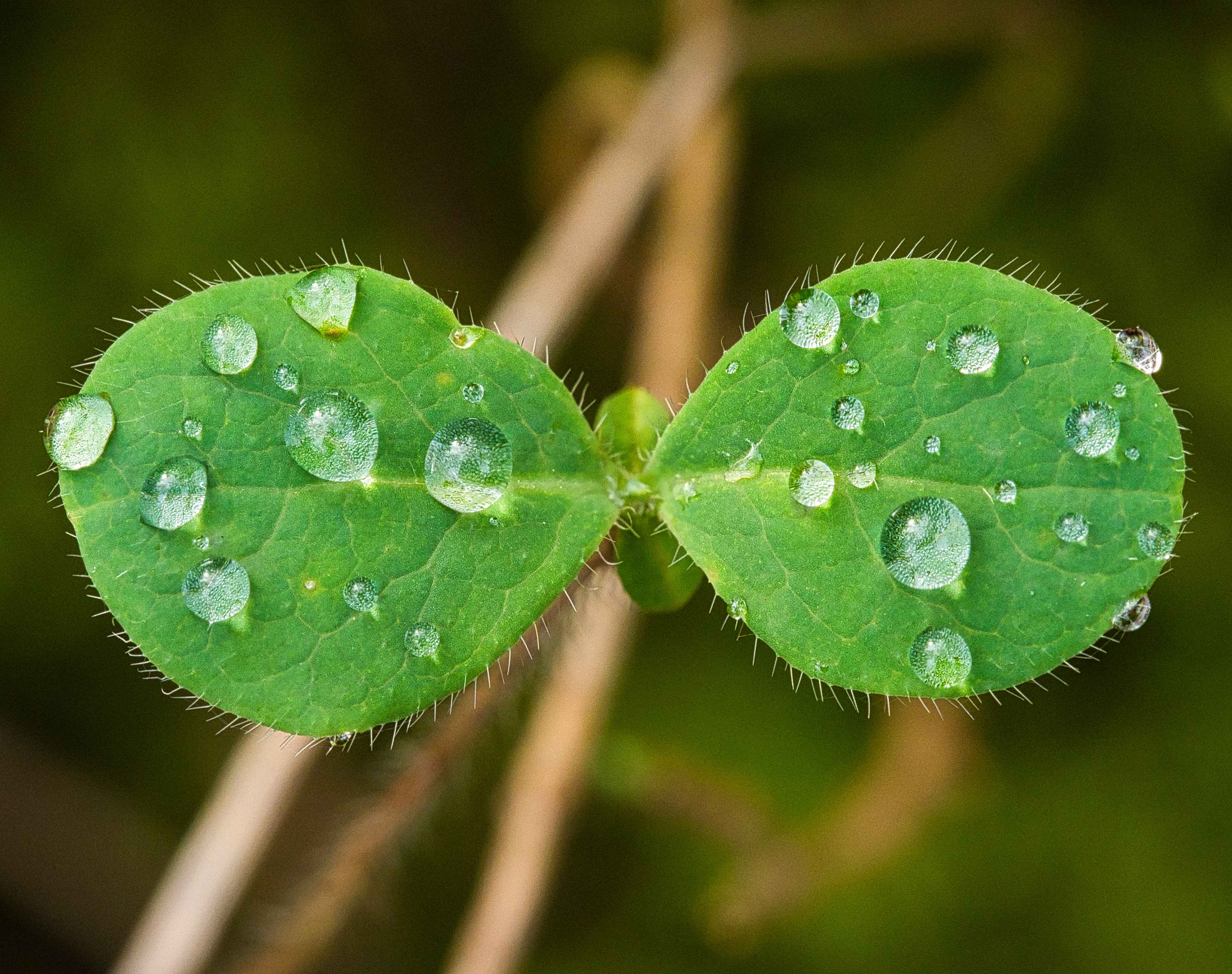 Oak leaves are not evergreen, but they are very tough. A fallen oak leaf is a great platform to find water droplets.