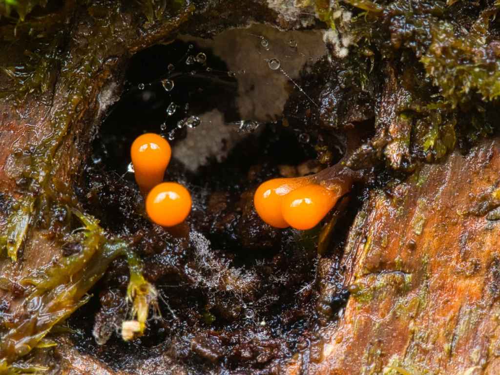 Soils are formed in woodland by decaying organic matter which is recycled by fungi, bacteria and invertebrates. Inside a fallen tree I found these slime moulds, another recycler and consumer of organic matter. I think these are a species of Trichia.