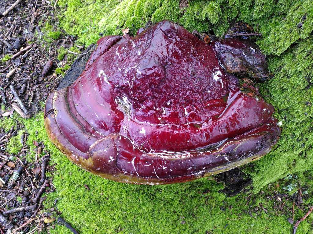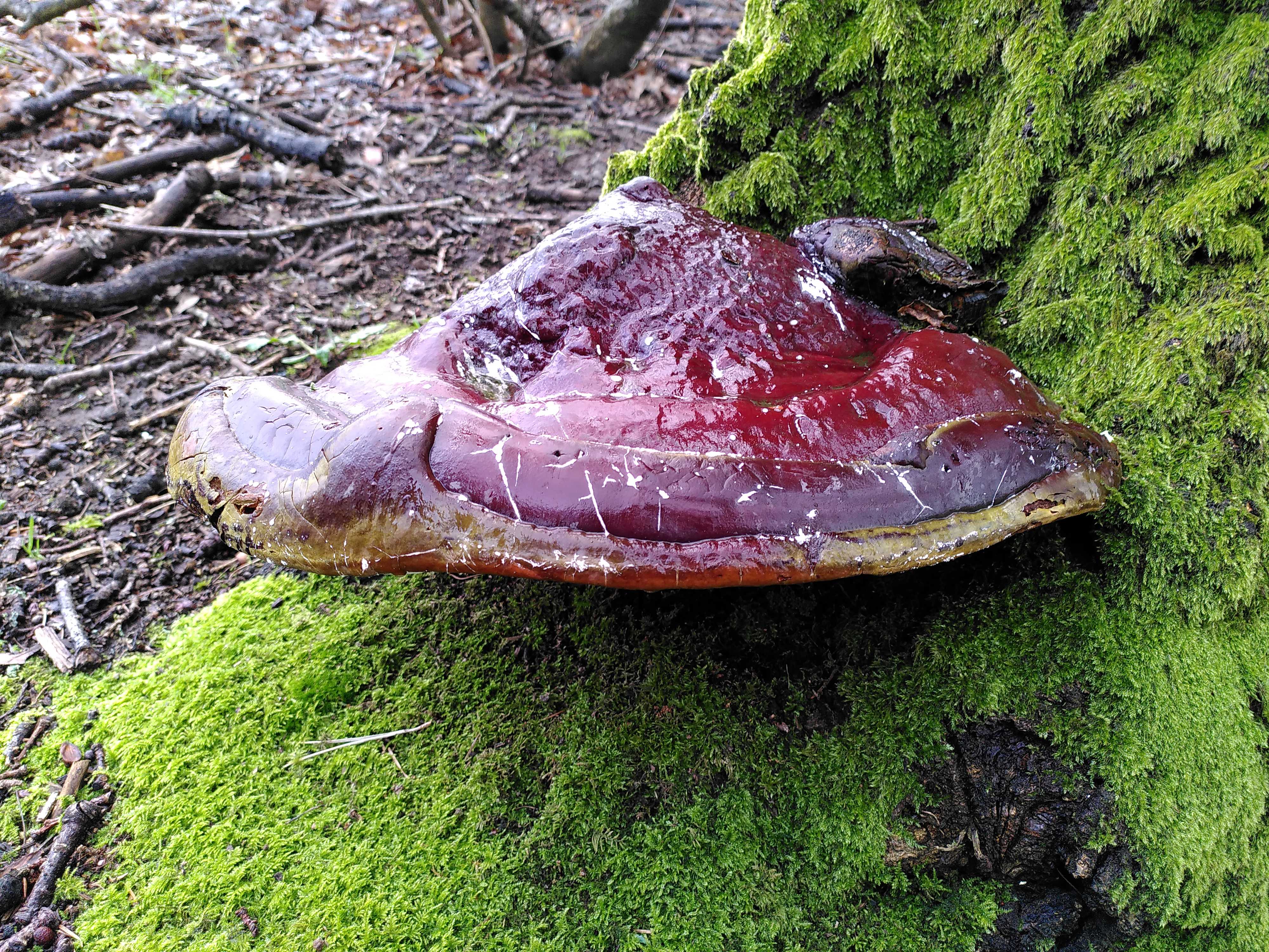 There’s a reason so few soil-based mushrooms are found in winter – the ground freezes and most fungal hyphae are unable to move through the frozen substrate. Fungi that grow from dead wood or other material can continue to do their thing. This rather pooed-upon bracket fungus is known in the UK as lacquered bracket. On social media you see lots of American accounts raving about reishis. There is even a website dedicated to the species under that name.