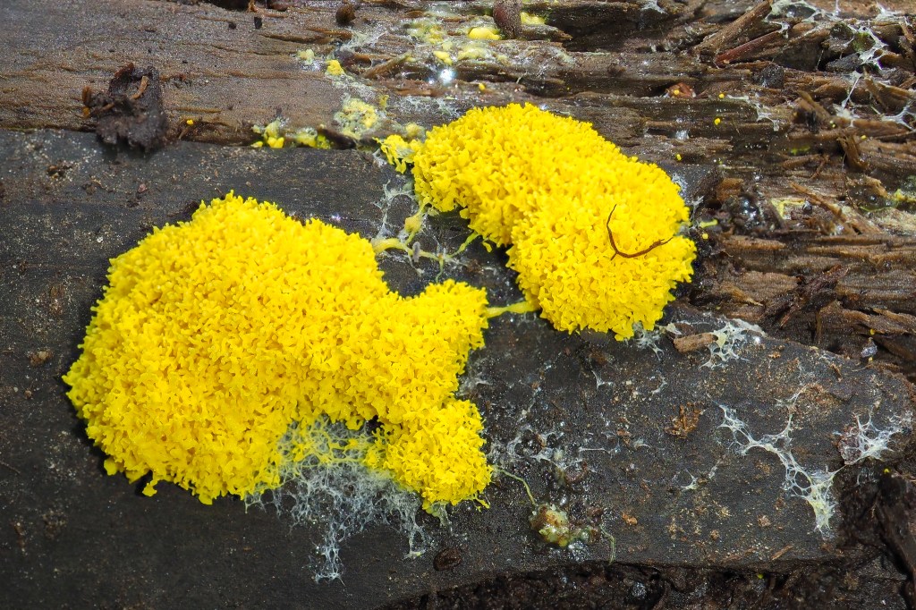 Though it is of course not fungi, this was another focus-stacking subject on that walk in the woods. Alongside a footpath, on a piece of wood being used as edging, I found this dog vomit slime mould (Fuligo septica)… yes that’s its common name. It was in the process of covering the surface of the wood and extracting nutrients and minerals along the way. Look at the networks of slime as they build across the wood.