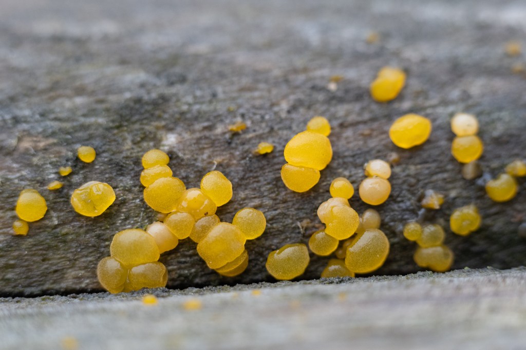 18th June 2021: common jelly spot grows on the bird table in my garden. After enough rain has fallen it bursts back to life and probably chucks out some spores.