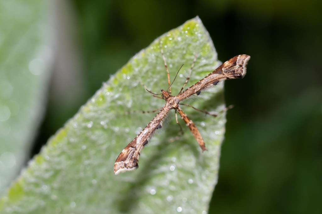 19th June 2021: a plume moth on another wet one in the garden. I love the pattern on this species, which I think may be a beautiful plume.