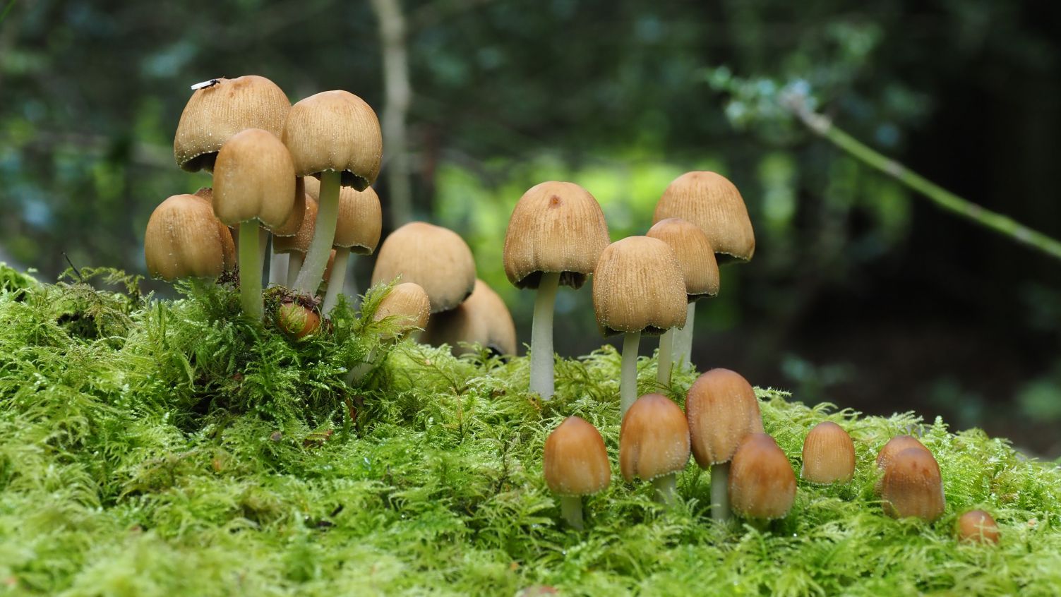 On the opposite side of the path a piece of wood was covered in feather moss. The moss was home to a gathering of glistening inkcap mushrooms. They were in wonderful condition, with varying stages of growth in the bright green bed of bryophytes.
