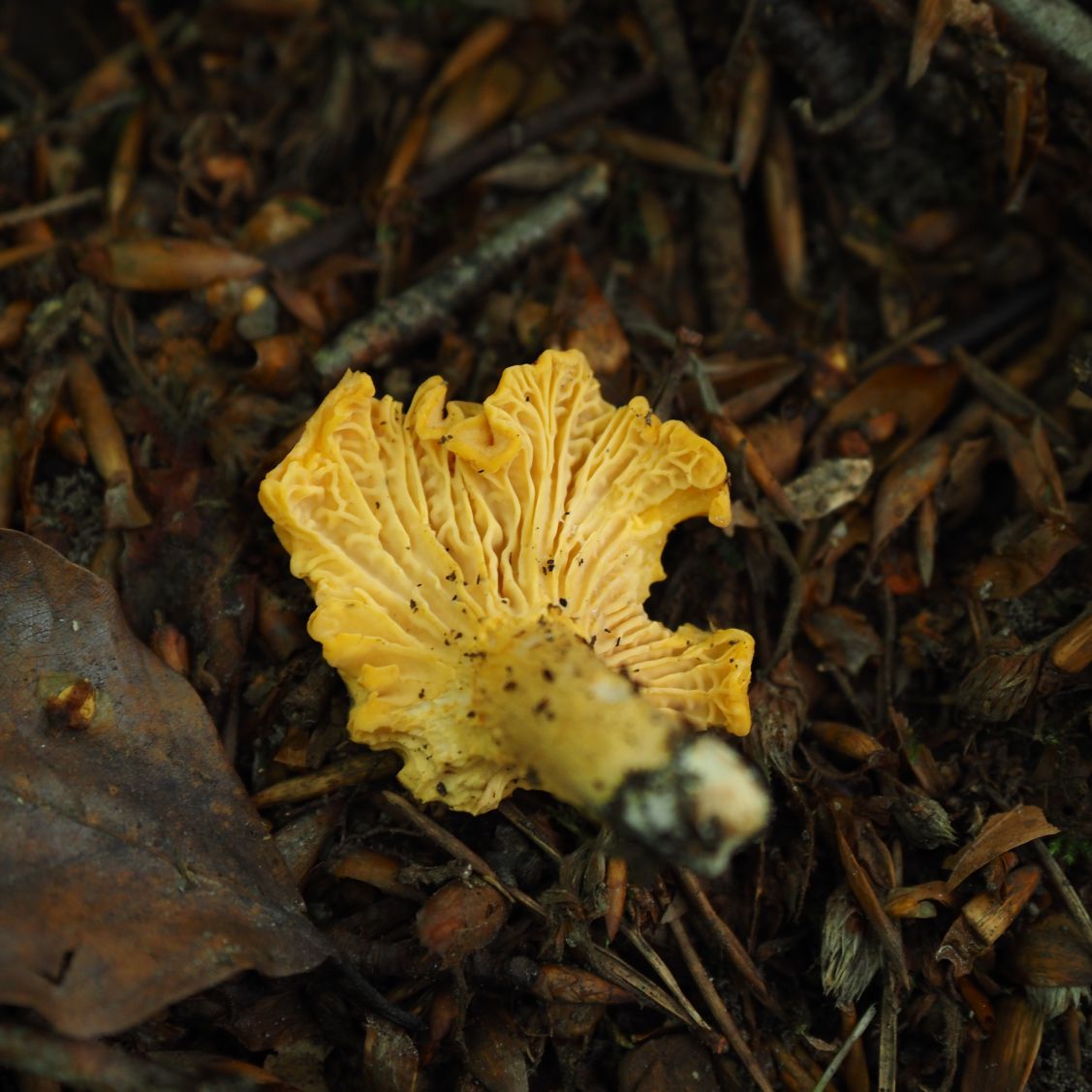 My hour was up and I had to head back to the car park. On the return leg I noticed some very small yellow mushrooms on the bank built up along the footpath. It clicked that they were probably chantarelles. I looked at the gills of one that had fallen loose and could confirm they were. There is a beech leaf in the left of the image above which provides scale – they really were tiny.