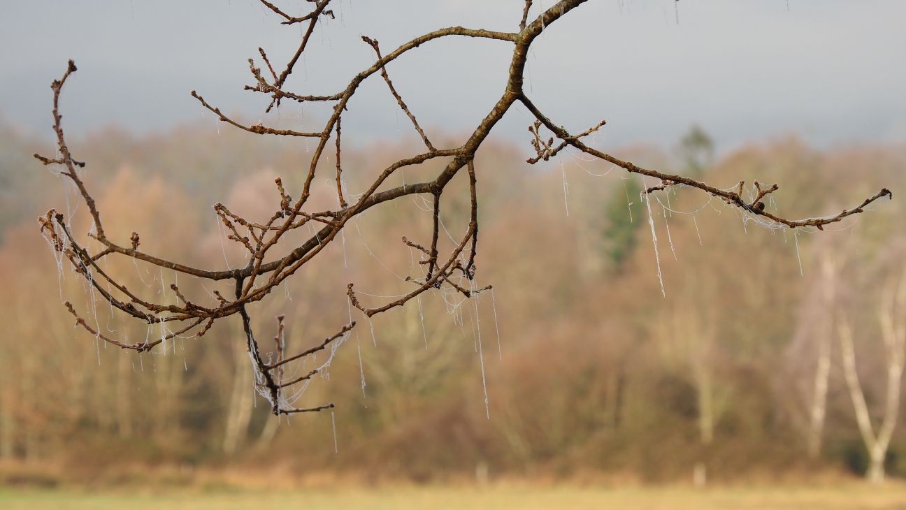 The spiders webs that remained were laced with frost, as this L-shaped twig displayed so well.