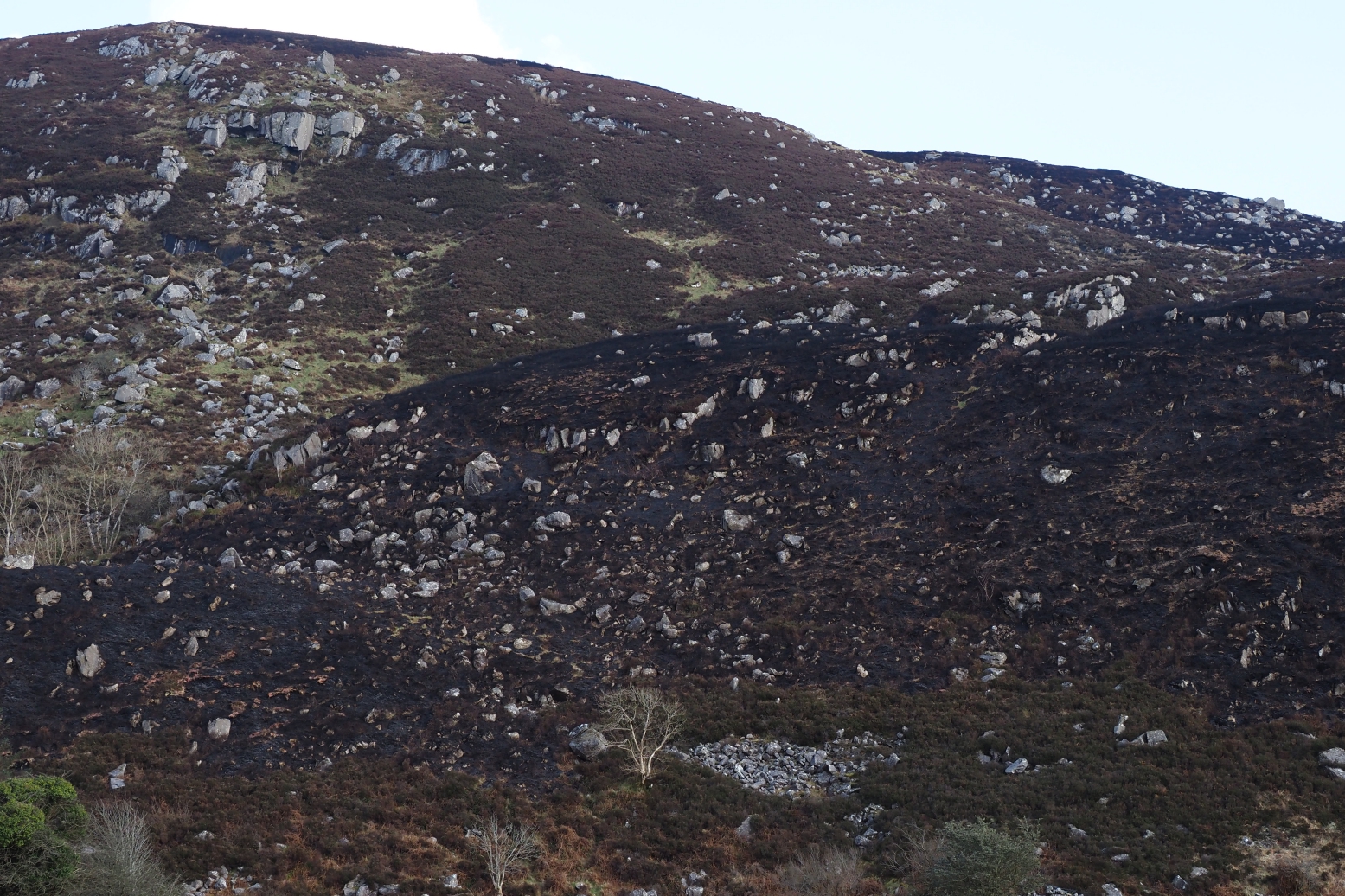 We arrived in Mayo to find the mountain burnt across a mile or more. This beautiful landscape with its rare plants, bog habitats, feral goats and moorland nesting birds, was decimated. We asked local people – who started it? One man said it could have been a farmer who just wanted a bit more grass, another woman said it was someone just “lighting a match”. Whoever it was, the authorities are not happy and it made plenty of news out this way. It was also an issue in Wicklow and Kerry.