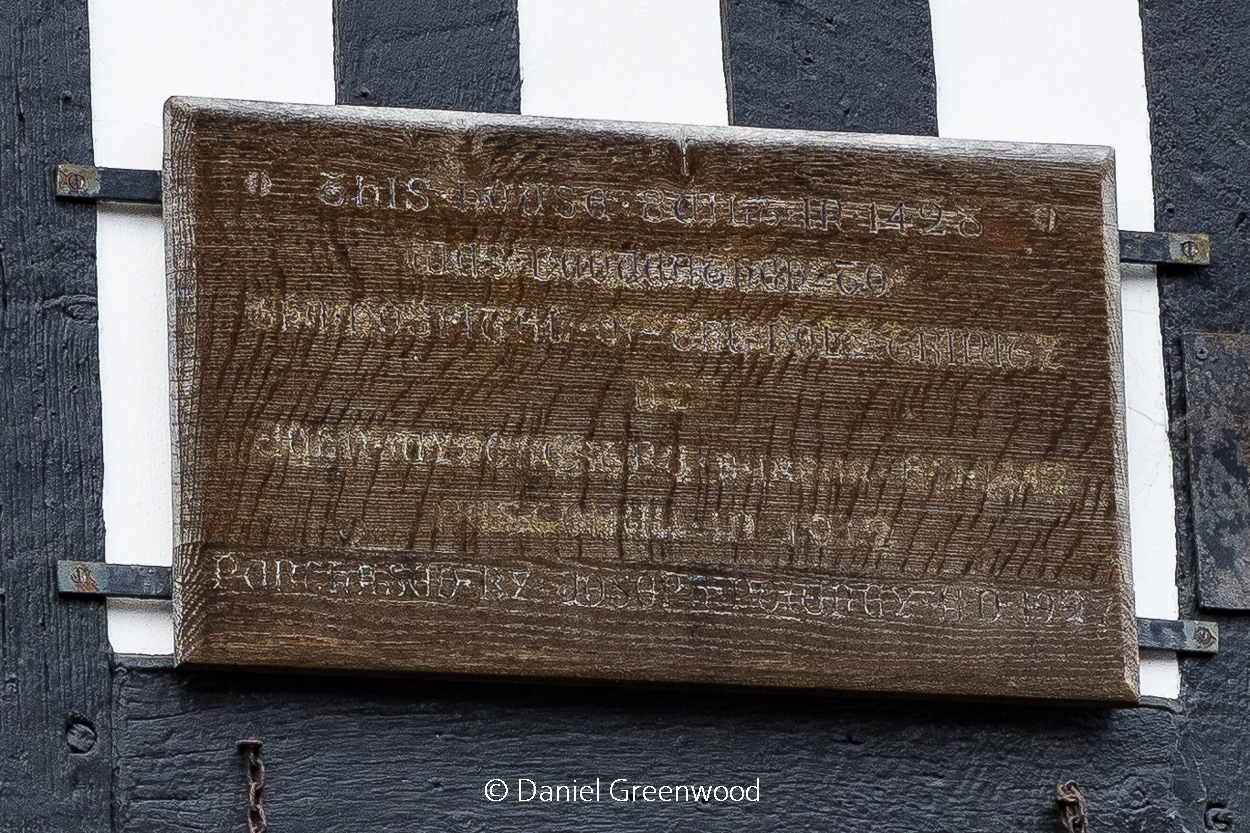 There’s a wooden sign on the pub but it’s difficult to read. I can make out: “This house built 1428.” Bottom line says ‘purchased by — 1927’.