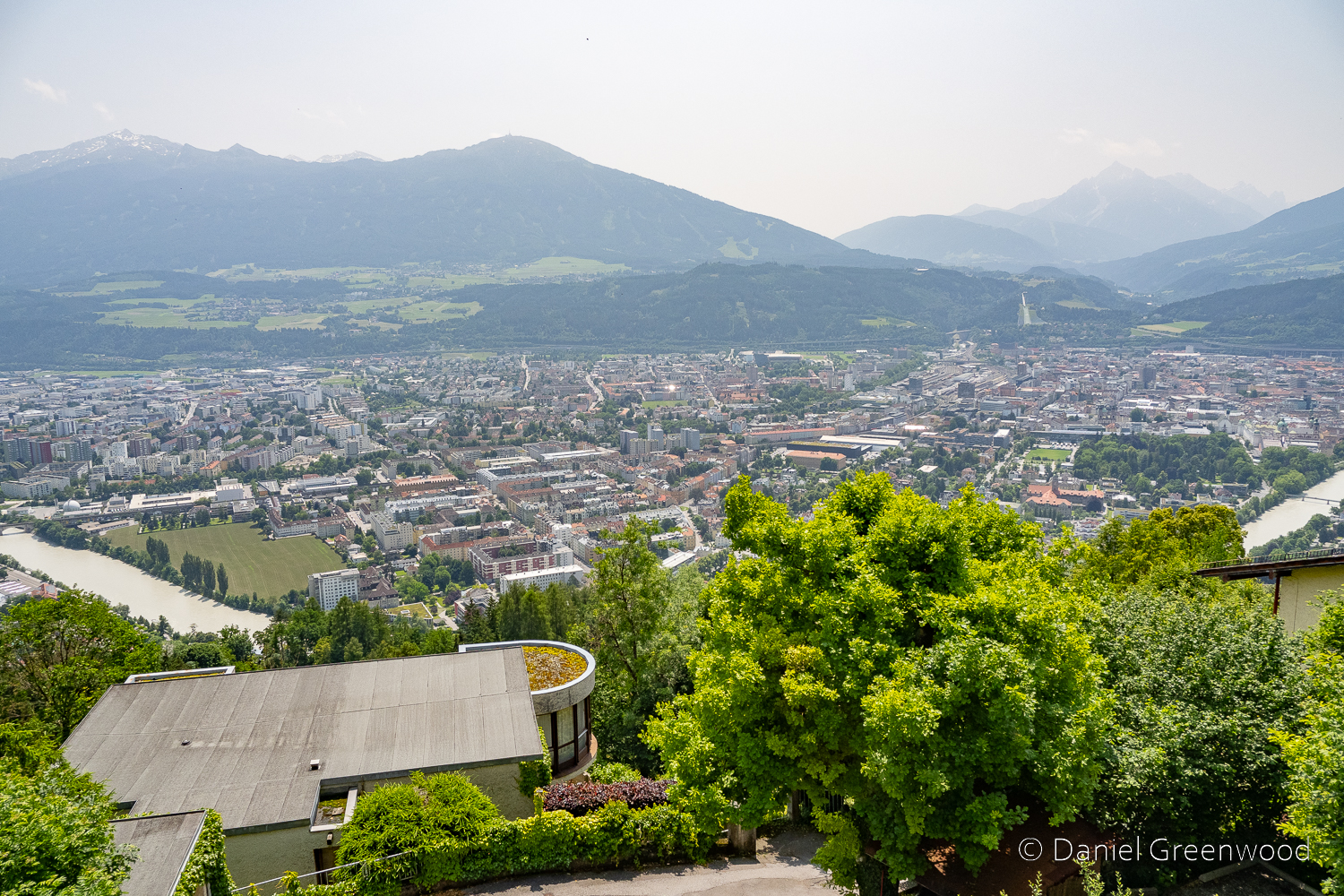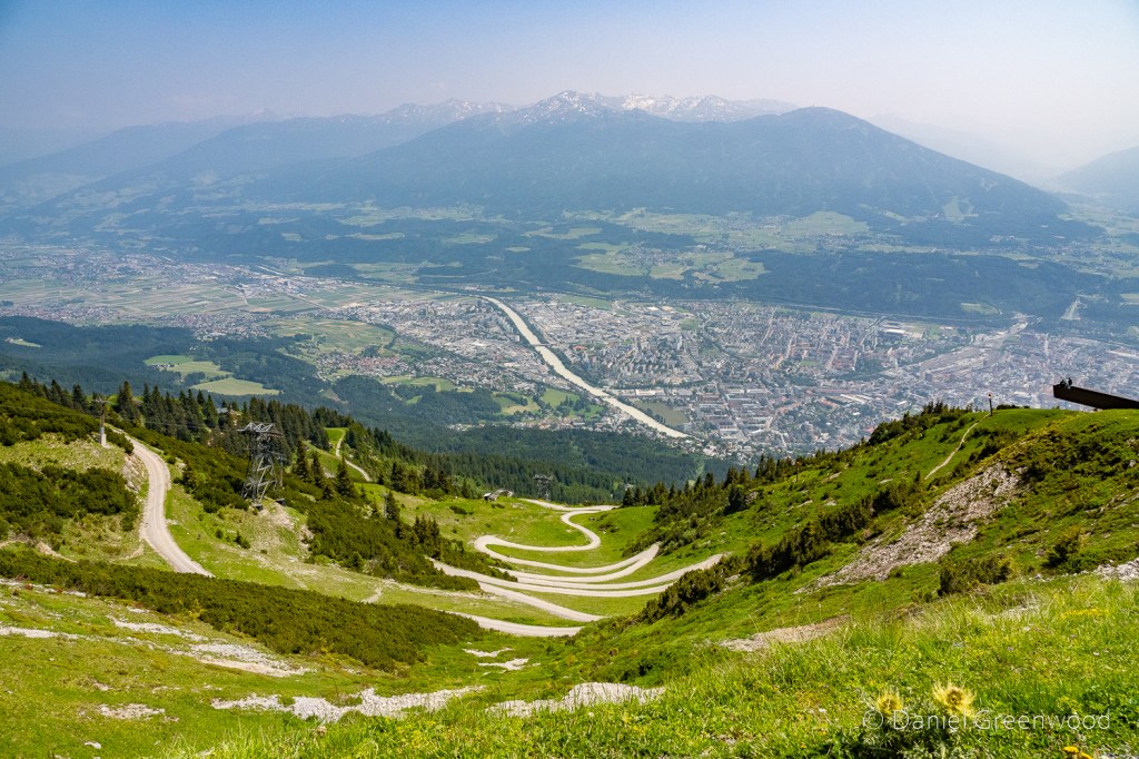 The road winds down to Hungerburg. In the middle-distance the Inn cuts through the city.