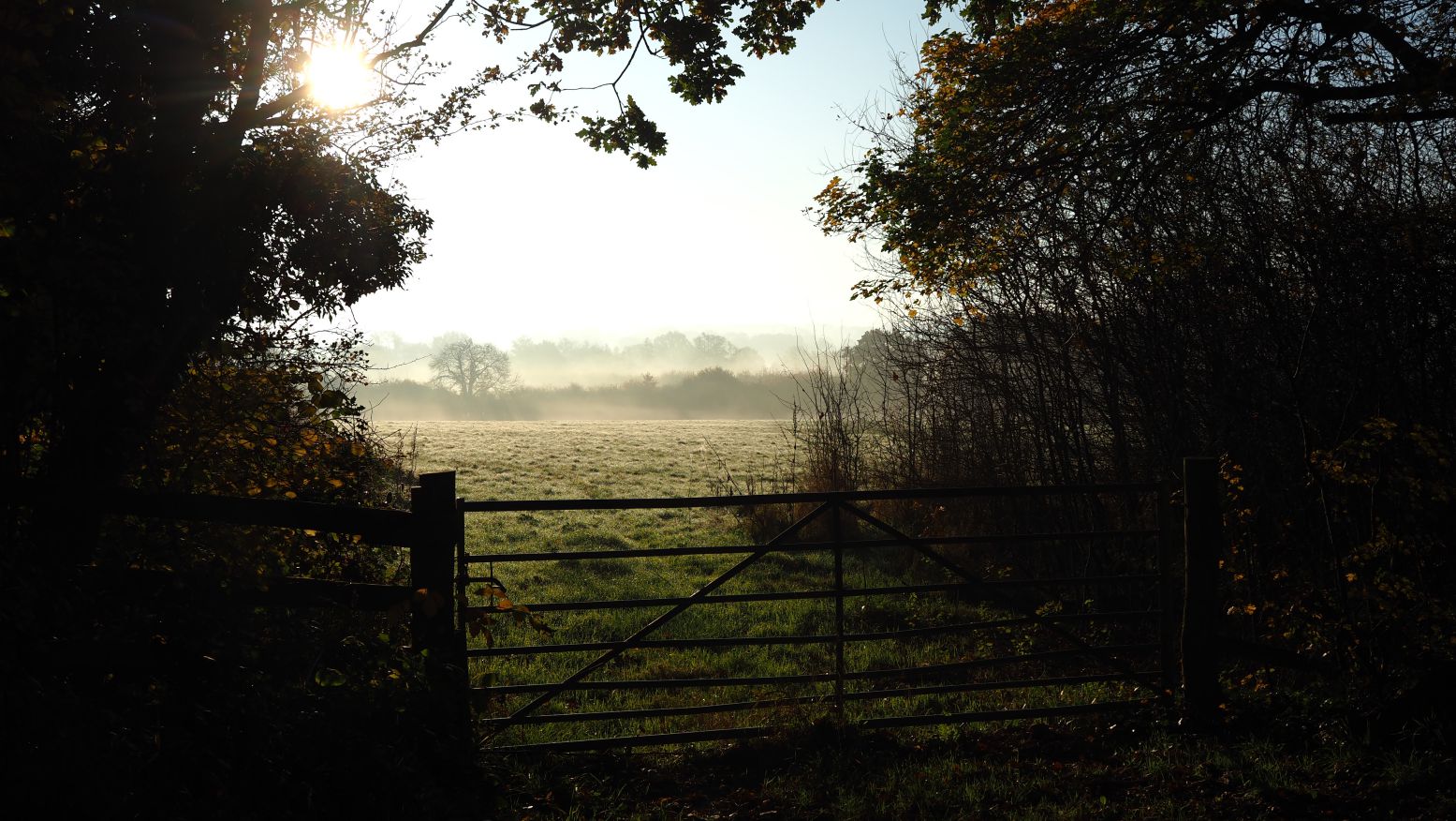 The distant woods and tree-lined hedges were silhouetted as the mist burned away in the sun.