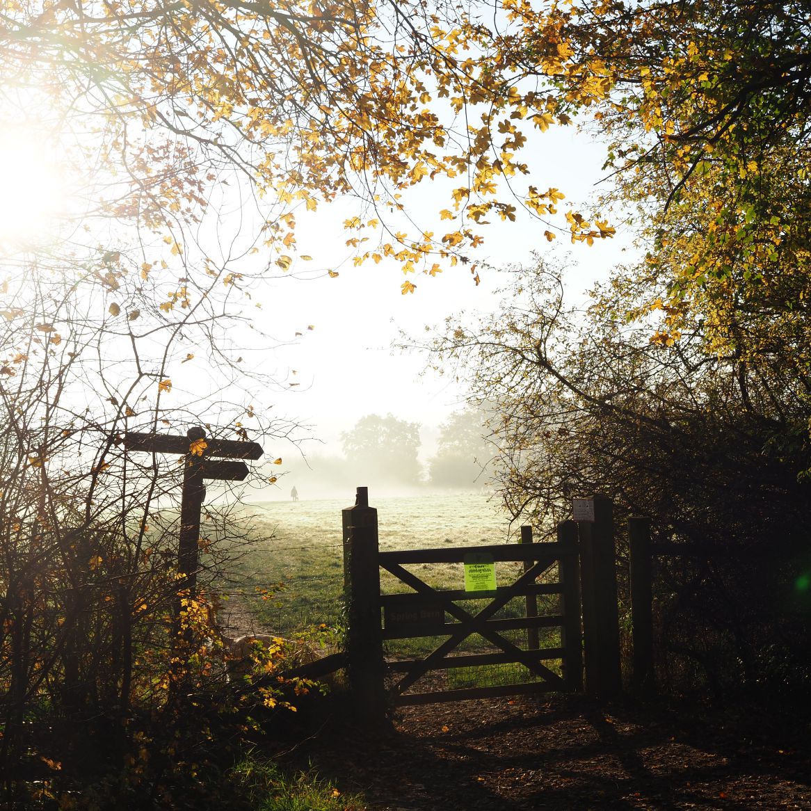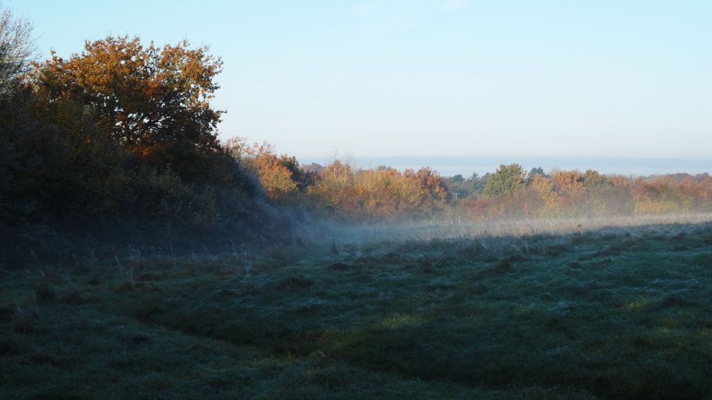 In one final field, edged by the yellow of field maple leaves, the mist remained. There was a dog that barked at me until called by its owner: “it’s because he’s afraid of you more than anything else,” she said.