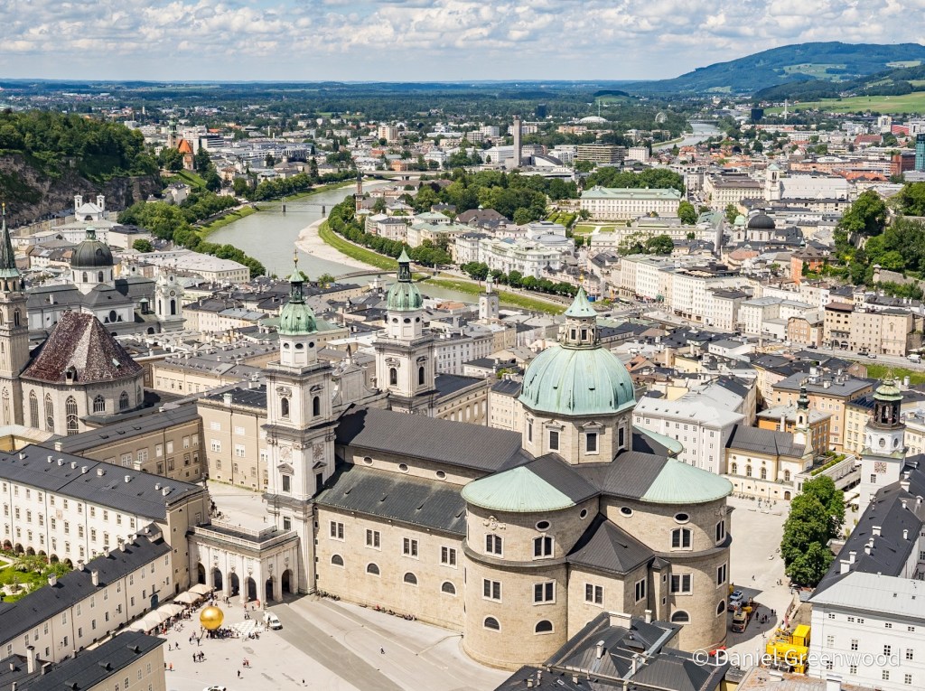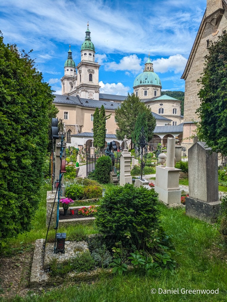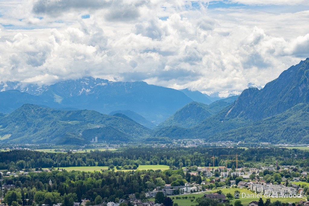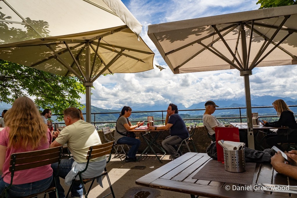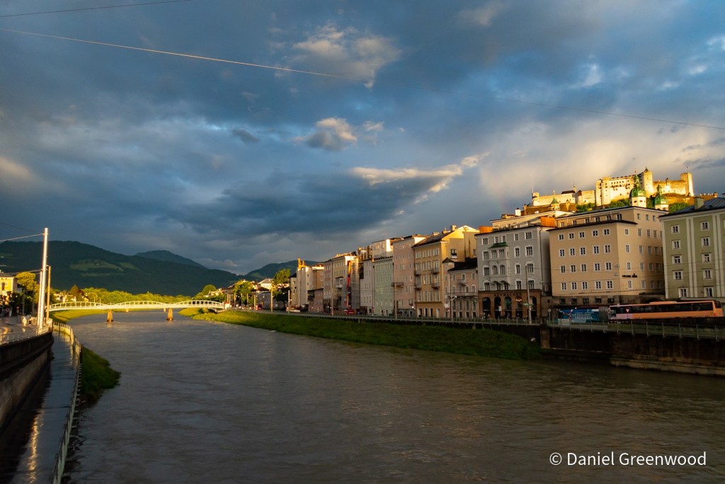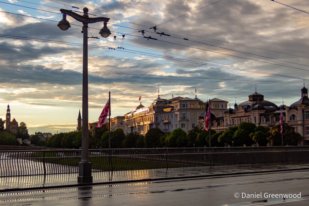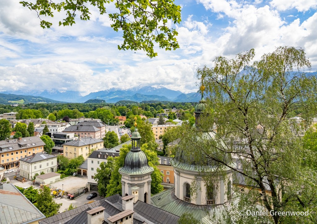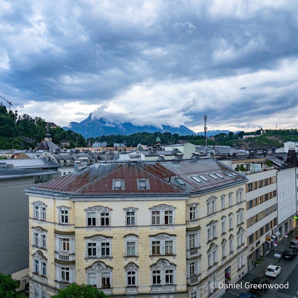 We left Innsbruck on a train to Salzburg, passing the peaks of the Karwendel Alps which lead eventually to Bavaria in Germany. I love travelling on Austrian trains, especially in the Alps. I don’t read a word of a book because the views are so amazing, and you can order food if you’re in first class, which is so much more affordable than in the UK.