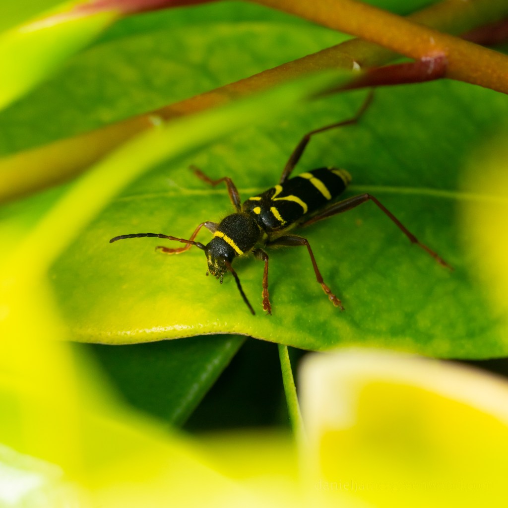 In the garden again. Really pleased to find a wasp beetle in the hedge just resting on a leaf. They’re another one of those wasp-faking insects, using those terrifying colour patterns to warn any predators. I also found this ichneumon wasp (I think). That is a fairly lethal looking ovipositor protruding at the rear.