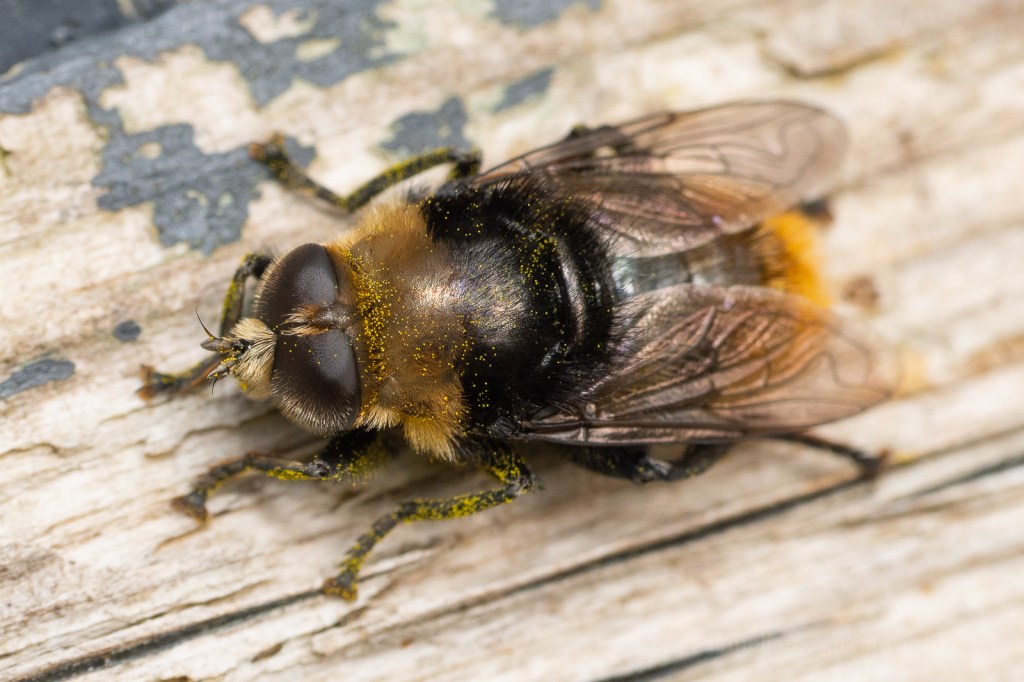 In the garden I spotted this bumblebee-mimic hoverfly on the fence. I’d seen them a couple of days ago duelling over territory, but they were too energised then to get a photo. This one was nice and chilled. It’s nice seeing all those yellow pollen grains, though I’m not sure which flower produced them. The caterpillar here may be the one that was taking shelter the previous day.