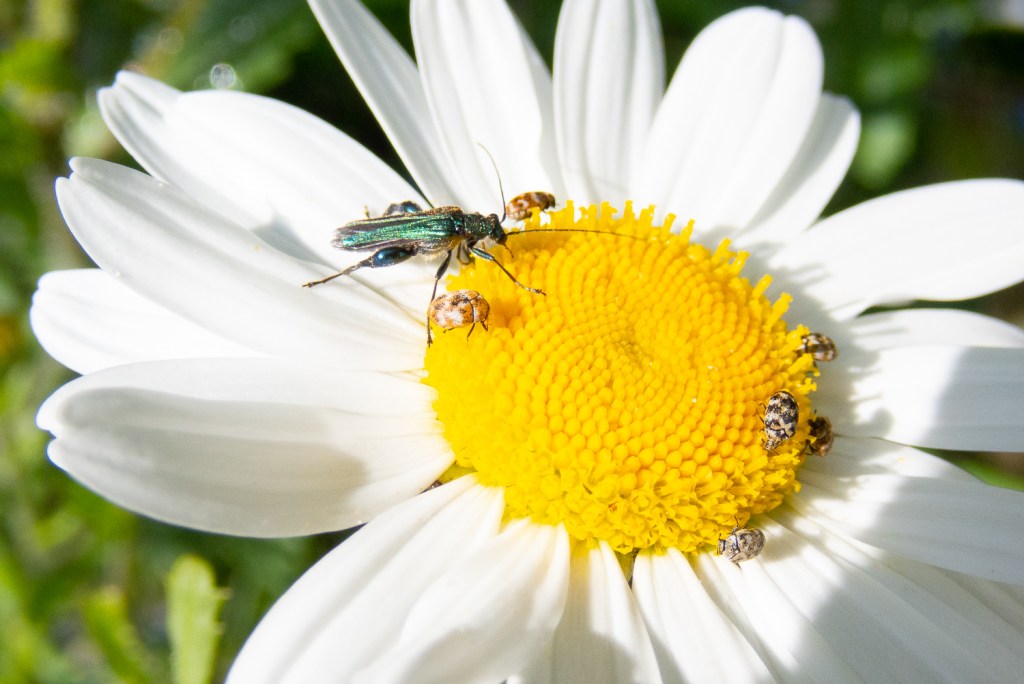 Day 3/30: a swollen-thighed beetle ‘enters the ring’, the nectar station of an oxeye daisy. I planted these last year and they’ve only flowered in the past few weeks. The small insects on the edges are carpet beetles. They’re there all the time.