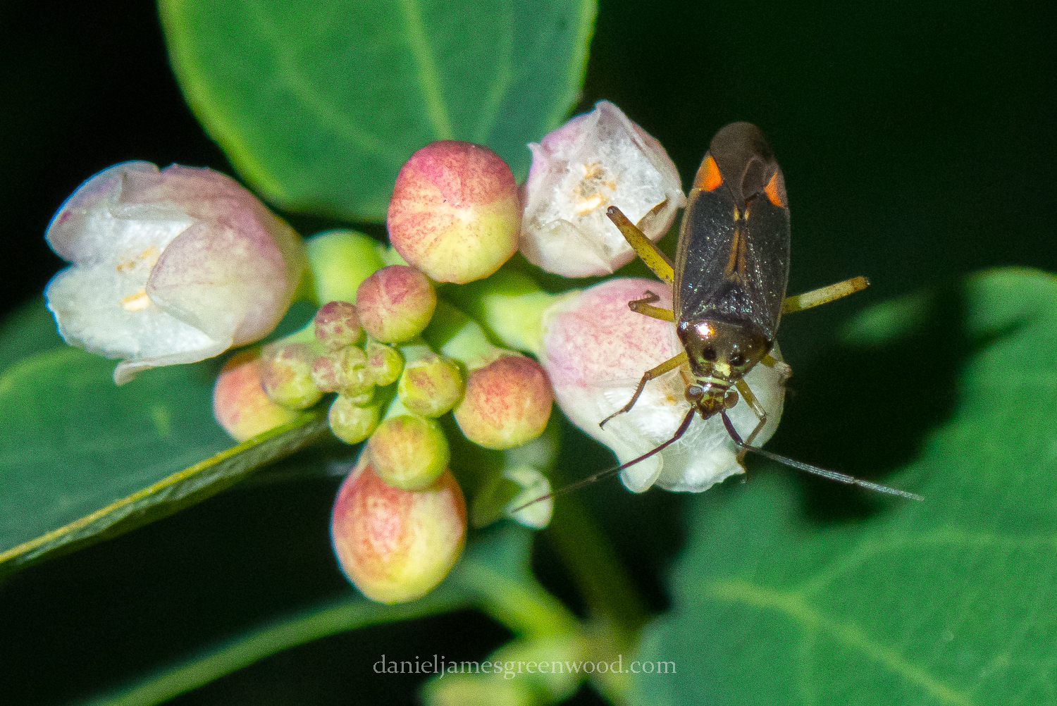 Day 28/30: an evening foray in my mum’s garden late into the evening, in cooler weather. I spotted this mirid bug climbing over the flowers of a snowberry.