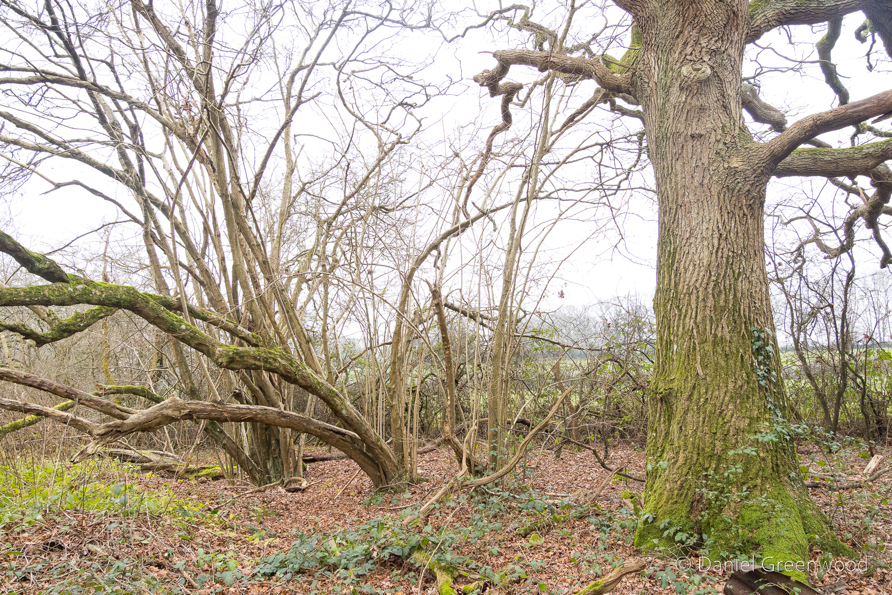 The woods are surrounded by open farmland. The make-up here is typical managed ancient woodland of old – hazel understory with mature oak trees (otherwise known as ‘coppice with standards’). Mr. Garton’s bread and butter.