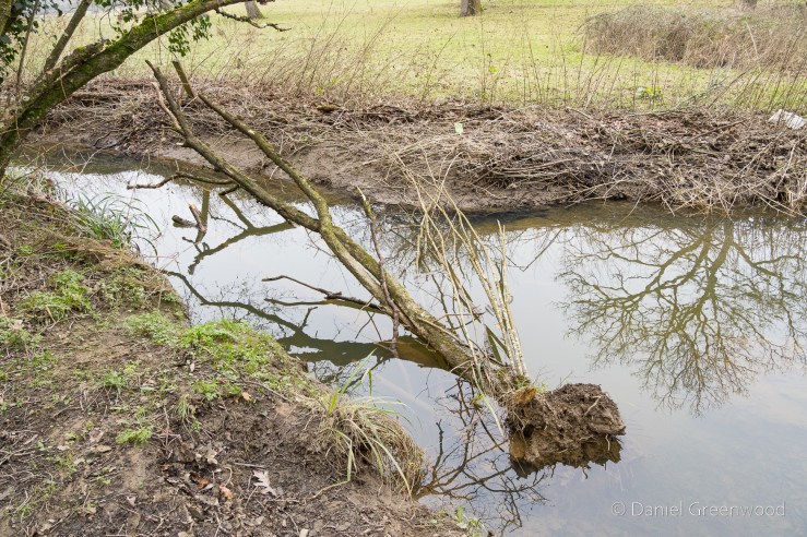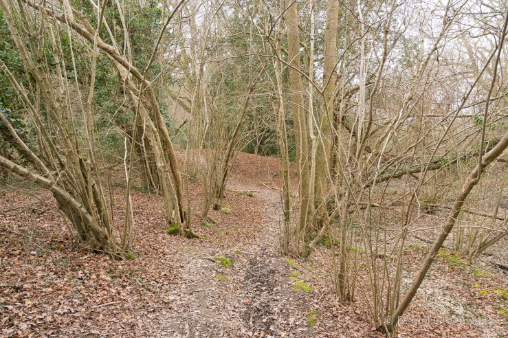 I got a bit lost here and ended up following a desire-line (an informal path) along the edge of this stream, as you can see on the map above. The erosion of the bank (possibly by people and pets entering it) may have contributed to this hazel losing its footing and falling in. It does look quite dead.