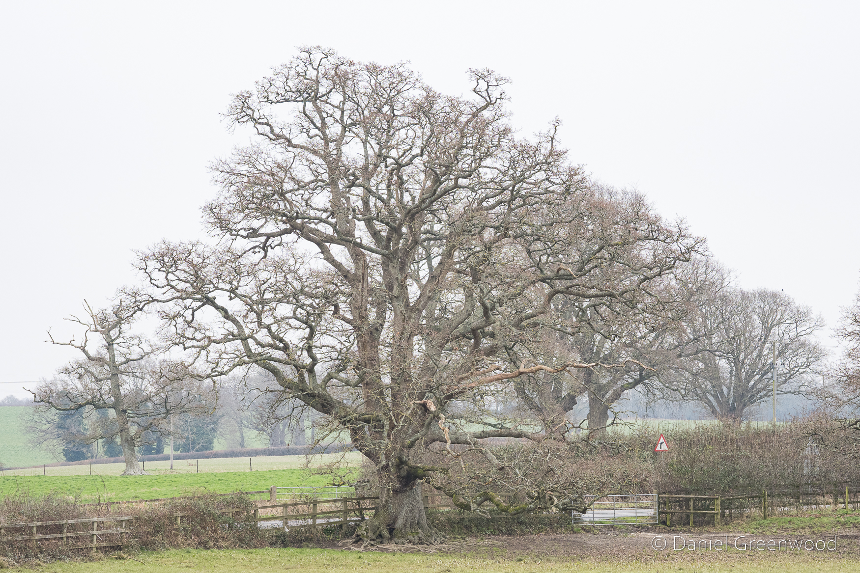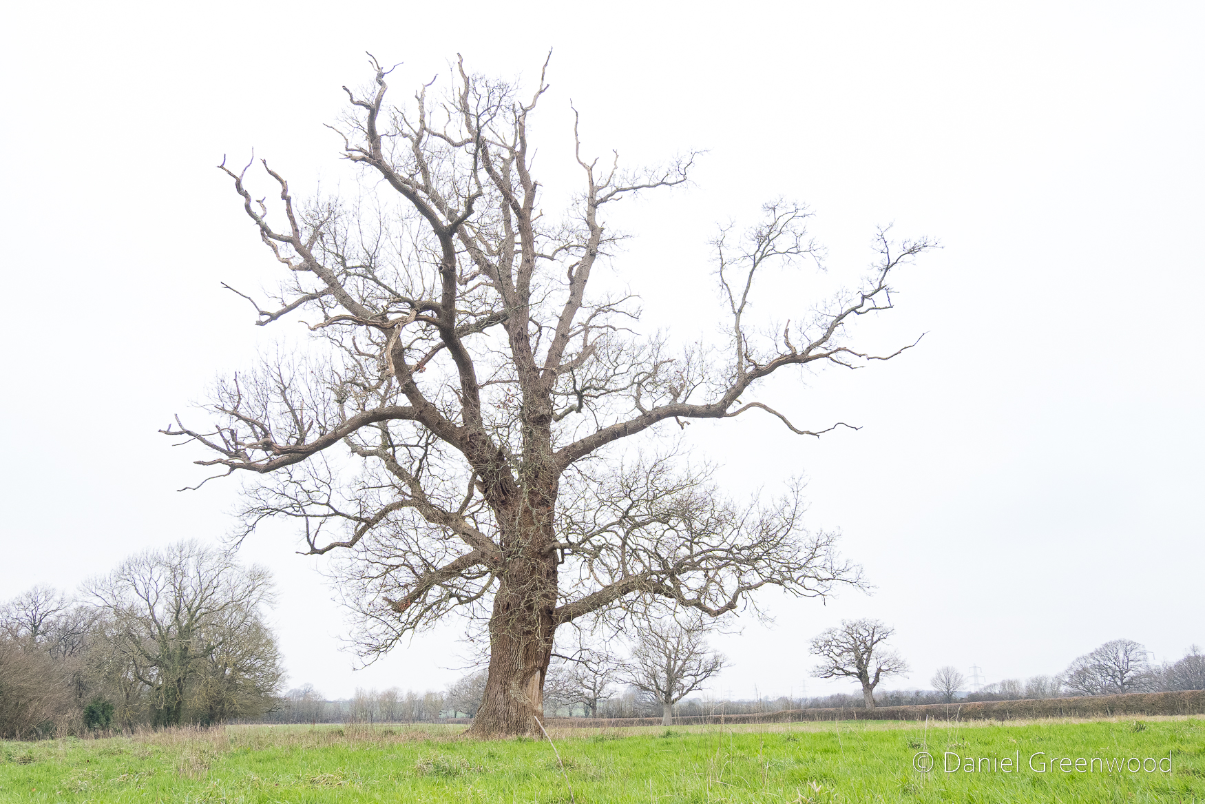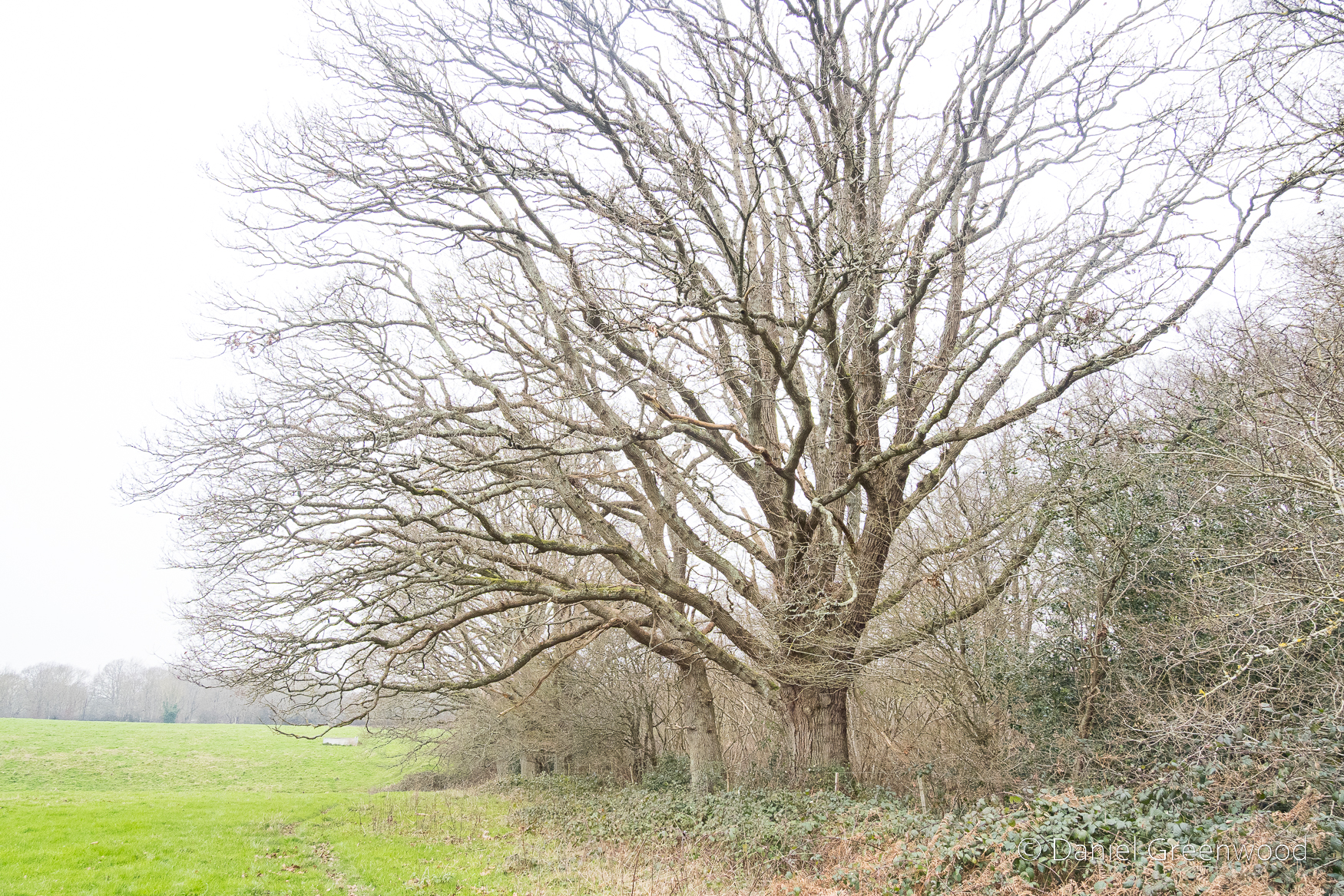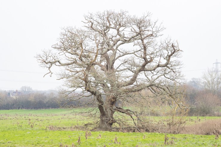 A rather sickly oak in a process of retrenchment as the upper branches die away. You can see more oaks dotted around beyond the hedgerow.