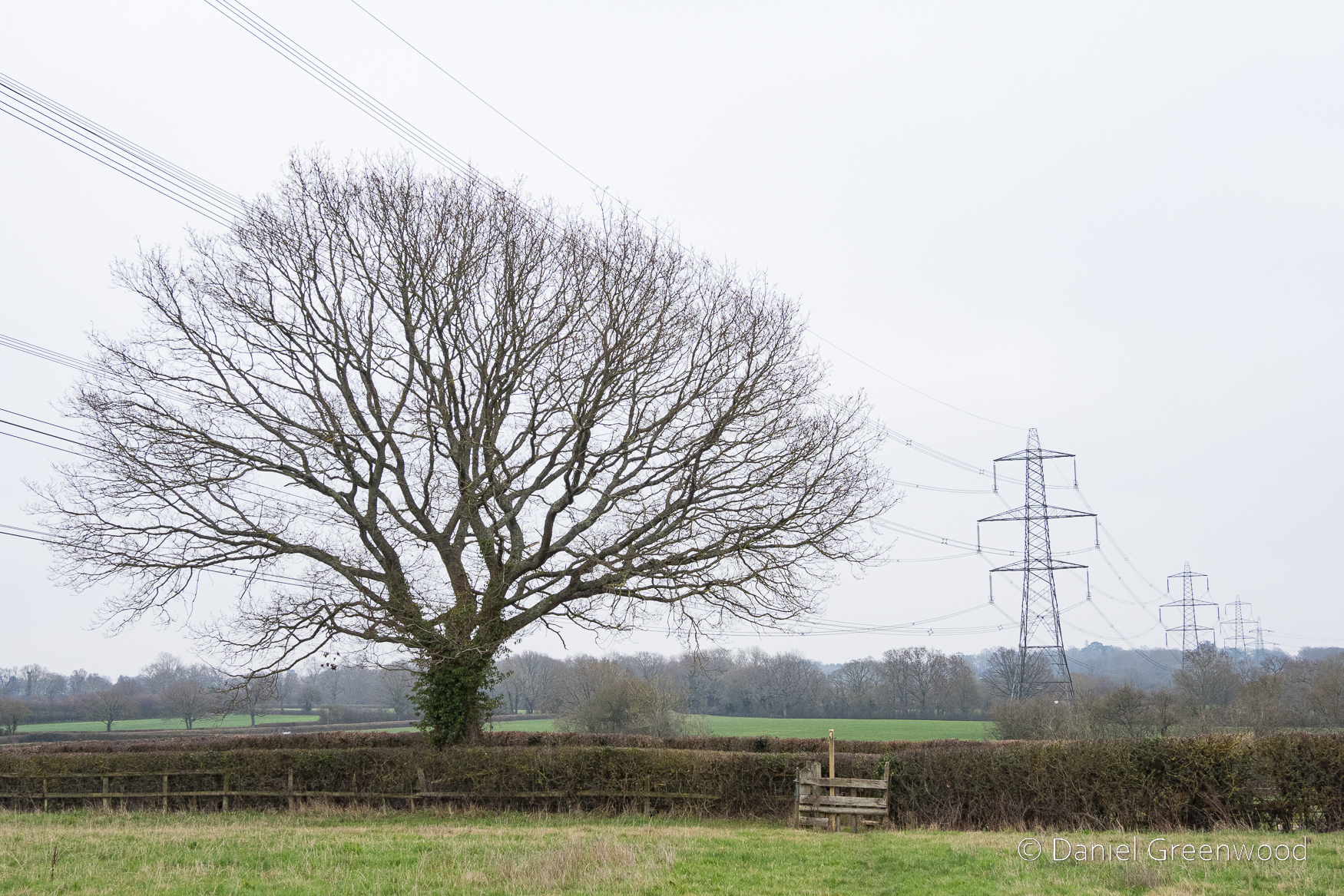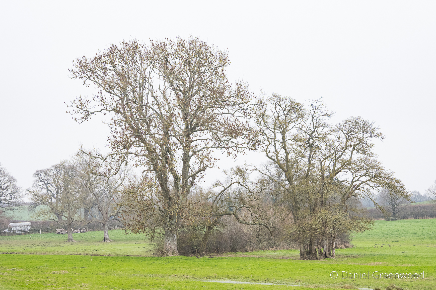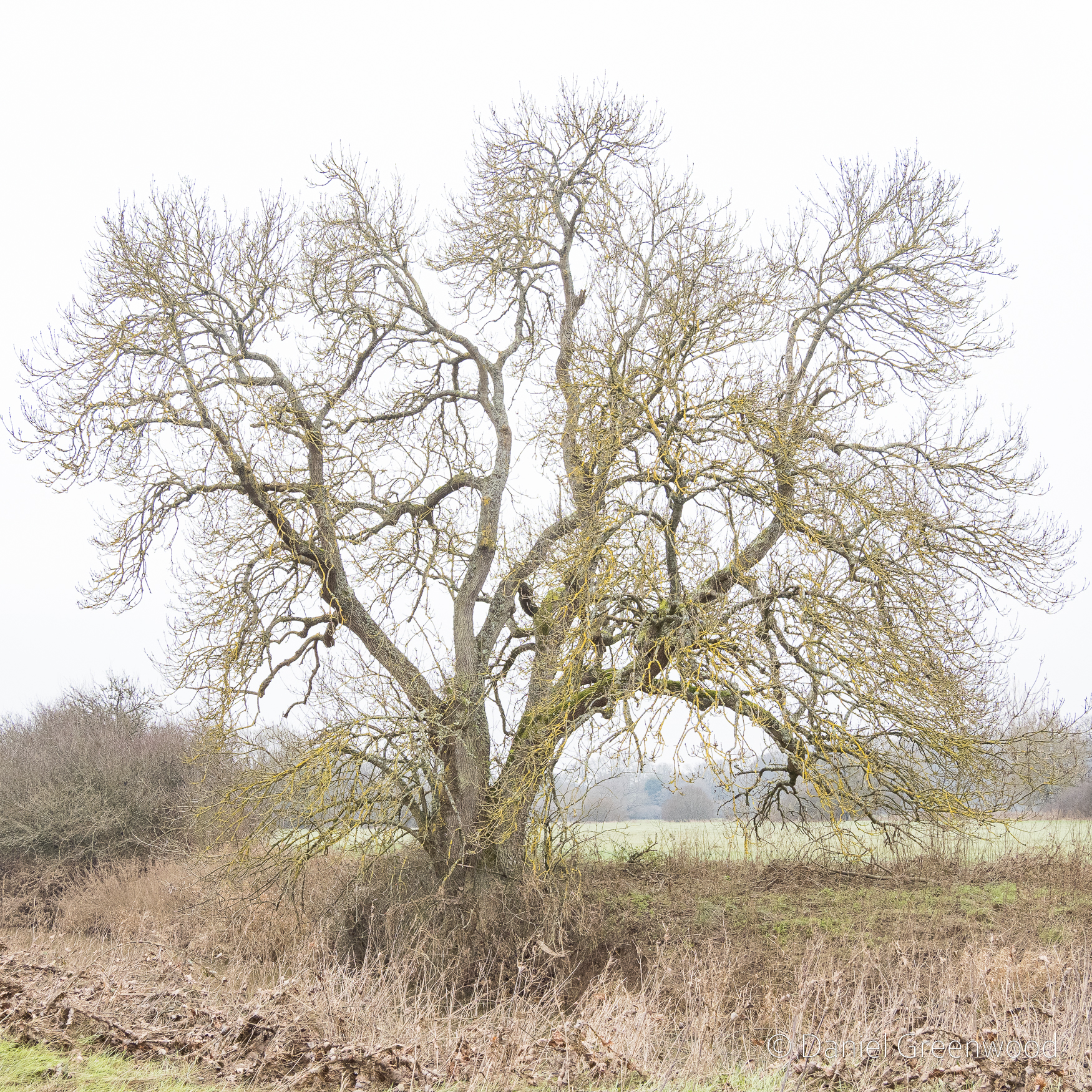 A rather sickly oak in a process of retrenchment as the upper branches die away. You can see more oaks dotted around beyond the hedgerow.