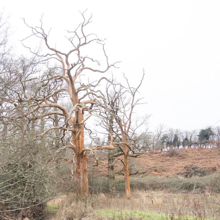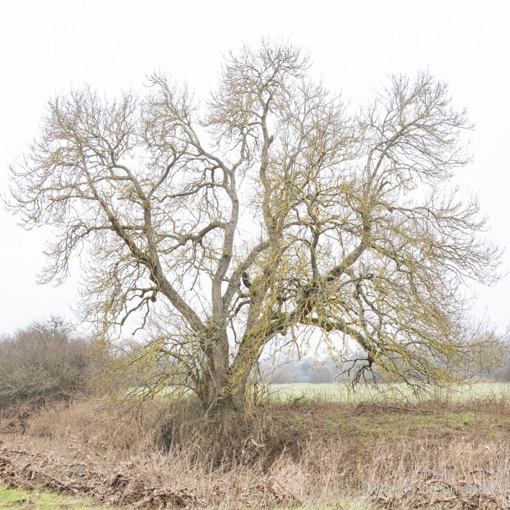 Ash trees would have been useful also, particularly for tool handles. One way to identify a distant ash tree in wet winter weather is the yellow glow on the outermost branches. These are xanthoria or sunburst lichens which of course thrive in wet weather. I would say this was a significant ash tree, and possibly had been pollarded, due to the branching taking place so low down on the trunk.