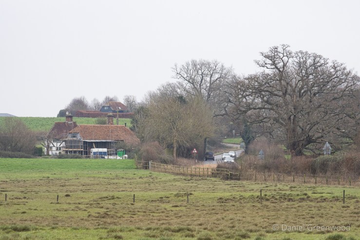 This is The Lordings, a Grade II-listed farmhouse dating to the 1600s (Historic England listing). With its uneven development and attached Sussex barn on the left-hand side, I had wondered how old it was. The windows of the house are in different places and rather small, which did suggest old age. The ditch in the image is part of a stream and pond. The landscape was lovely here, formed by the movement of water over time, which makes me think that’s a natural spring-fed watercourse. Little Lordings Wood sits nearby, and once upon a time woodland will have covered this entire area. ‘Lordings’ appears throughout this walk but I can’t find any more information about the significance of the name.
