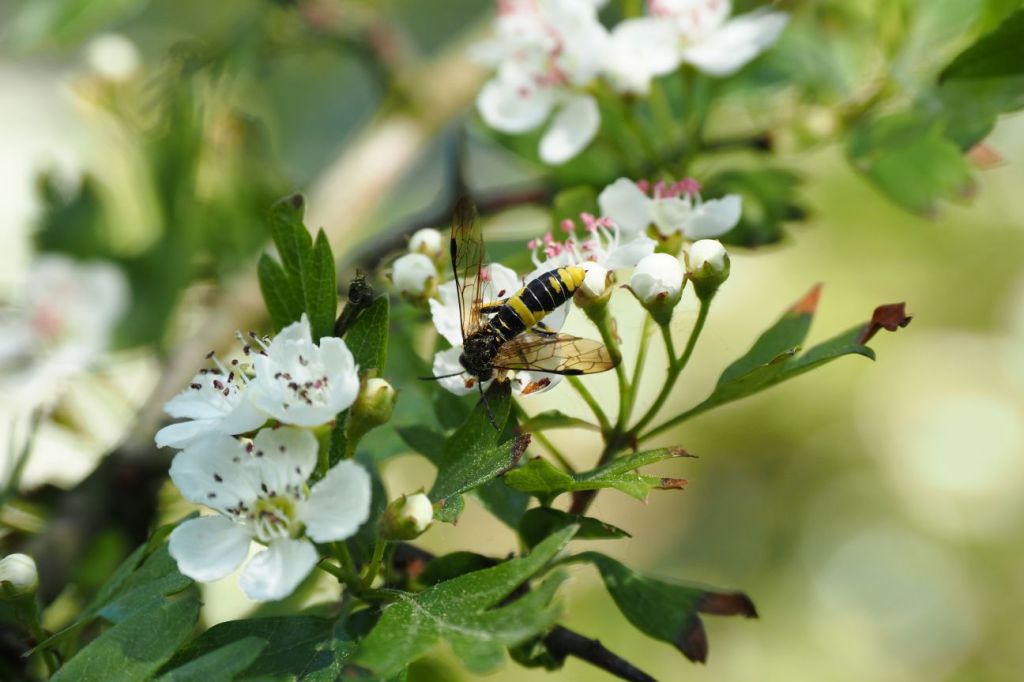 Hawthorn peaks around the end of May and I always look for insects on its nectar-rich flowers. I didn’t have a macro lens at the time but with my zoom found this large sawfly nectaring. Sawflies are relatives of bees and wasps, though sawflies actually came first. Their reputation is usually defined by the behaviour of the larvae of a species which can eat roses. You can of course say the same about many other species, moths for example.