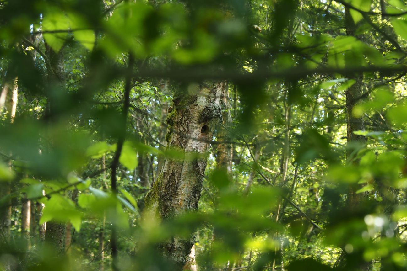 Continuing down the path I saw that a hole had been made in this standing dead birch tree. I could hear a nestling but also another woodpecker nearby, outside of a nest. I used the foliage seen here to hide for a while – still on a footpath – and see what would happen.