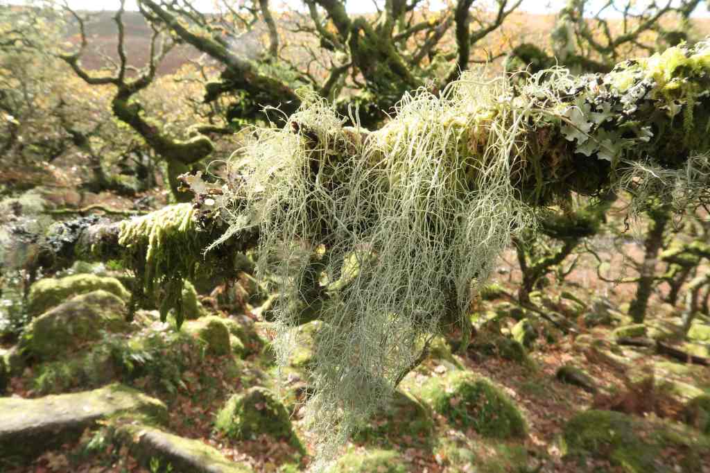 The lichens in woodland like Wistman’s are found on rocky substrates and the branches of the trees. It’s interesting that these boulders are at great density in this woodland but not the same in the wider landscape. That is probably because the wider landscape has been cleared of woodland and then the boulders left behind, for livestock grazing. Woodland was cleared from Dartmoor long ago, mainly during the Bronze Age, from what I know.