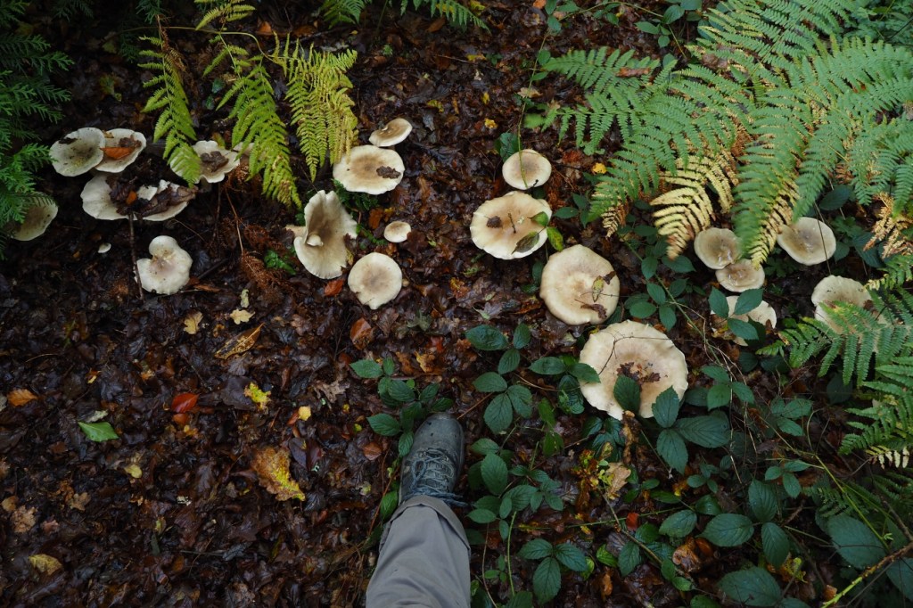This was another day chock-full with mushrooms. It began well with a nice indicator of mushroom season when we found a gathering of clouded funnel on a roadside verge. This is a fairly common mushroom that can usually be identified by its size and the clouded tops. My boot is here for scale, obviously.