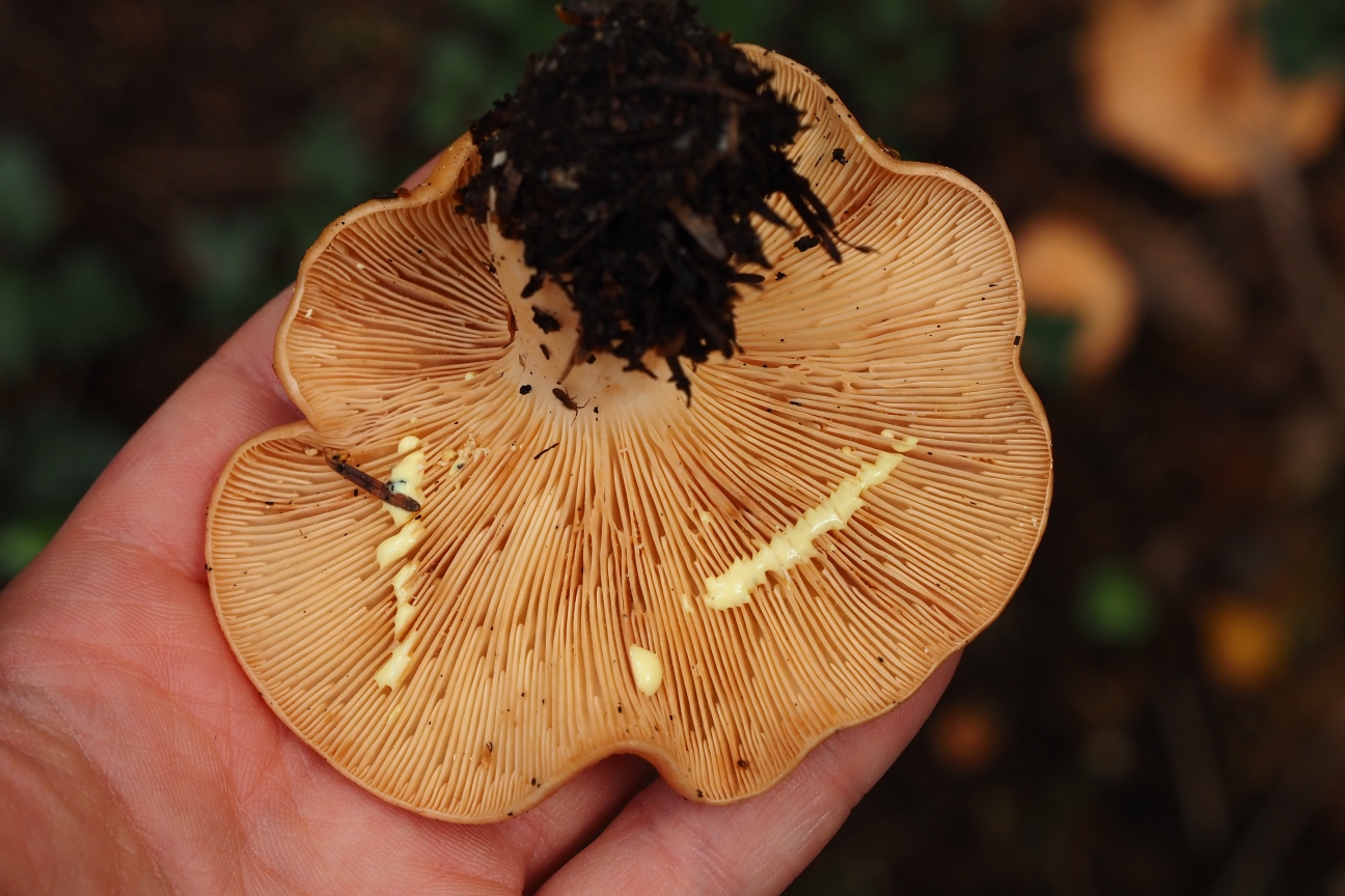 On top of a wood ant’s nest there were two mushrooms that looked interesting. I could tell that they were milkcaps from the unusual caps and the concentric circles. Turning one of them over I cut the gills with my fingernail and, sure enough, the gills produced milk. I don’t know what the species is.