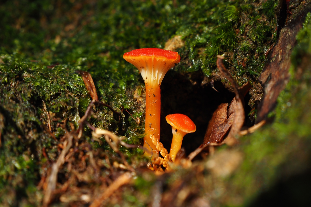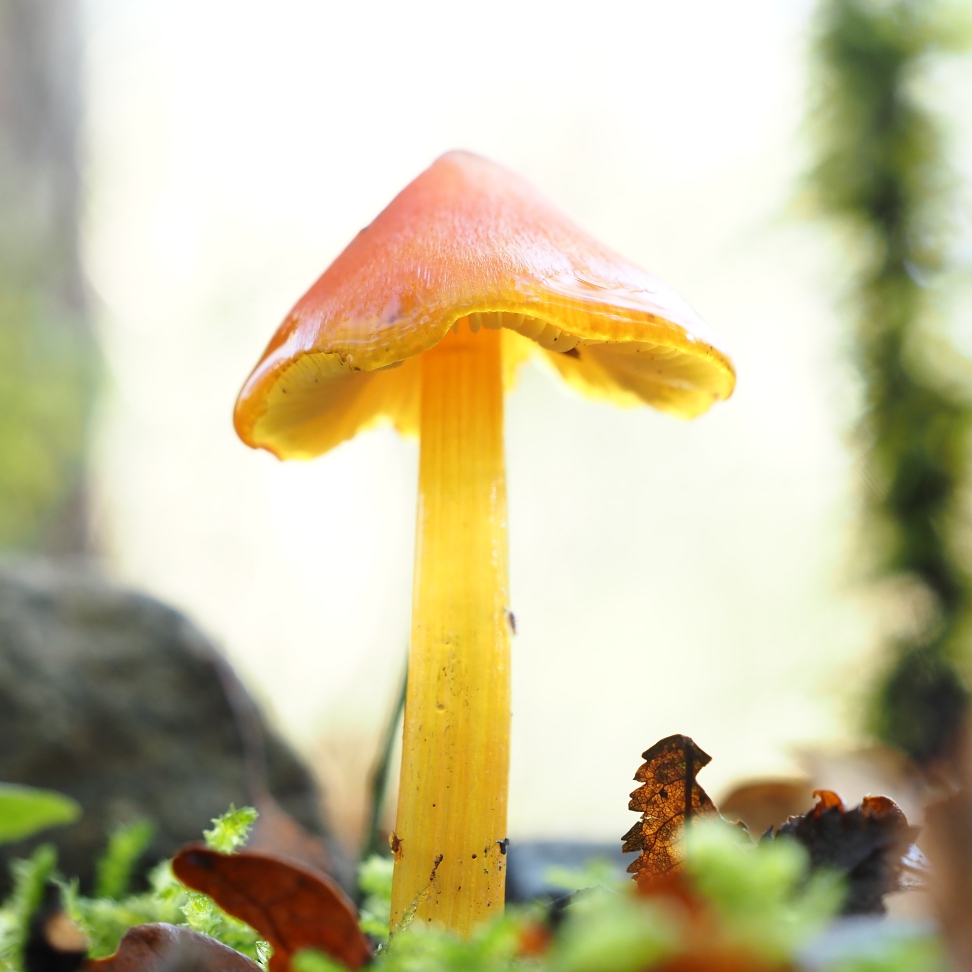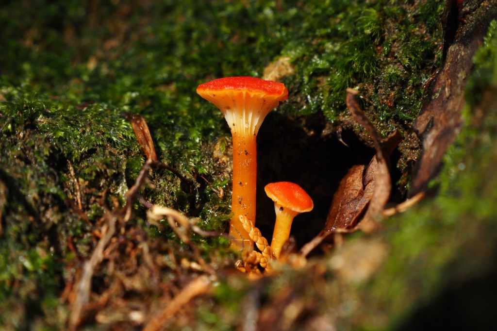 Now here is one I have managed to identify. These tiny red-orange mushrooms were growing from the same habitat as the unknown species before. These beauties are goblet waxcaps, looking like they’re standing on the threshhold.