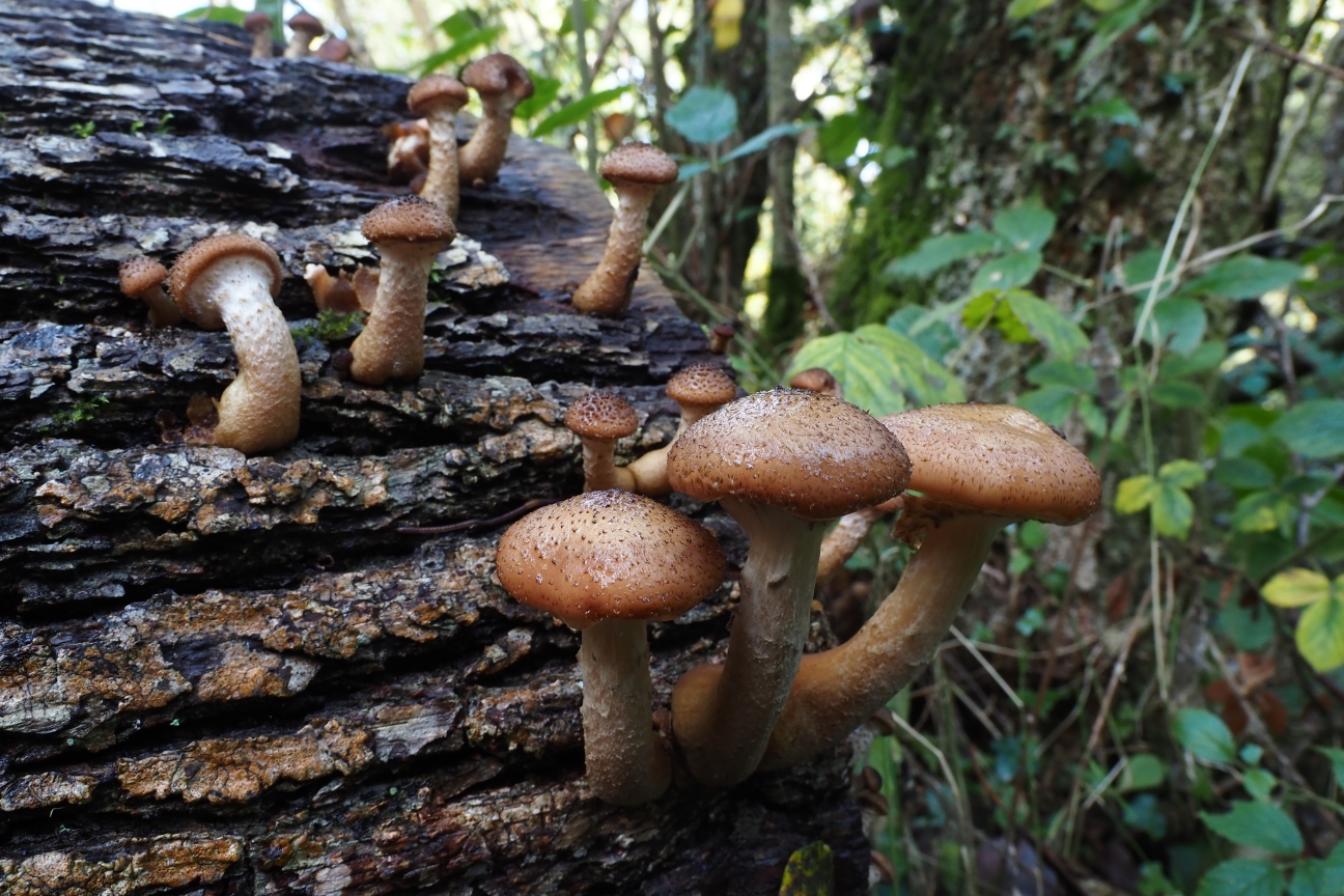 This was one of the nicer finds, what is probably golden scalycap (Pholiota arivella). It was a large spread at the base of a tree, where this group of mushrooms can often be found.