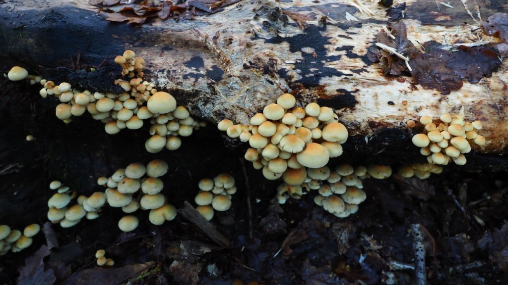 Sulphur tuft (Hypholoma fasciculare) was at almost every location where other mushrooms were fruiting. It is possibly the most common fungus I encounter, especially in woodland. This was a lovely scene and no surprise that this mushroom was making a home there.