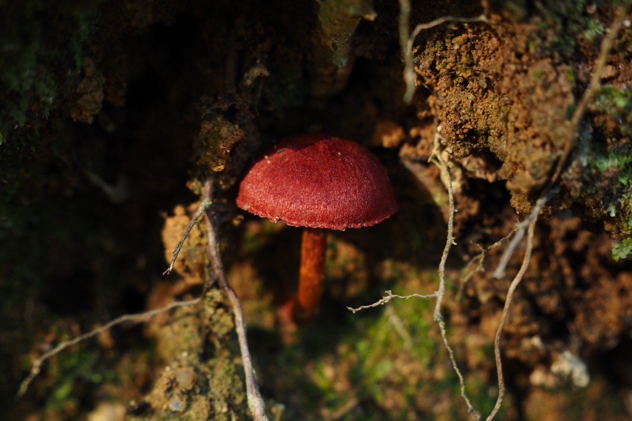 This gorgeous little red mushroom was growing from the exposed soil of the trackway. This isn’t a mushroom I can remember seeing before.
