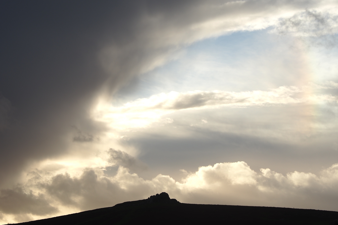 Haytor Rocks silhouetted against the wild skies often seen over Dartmoor.