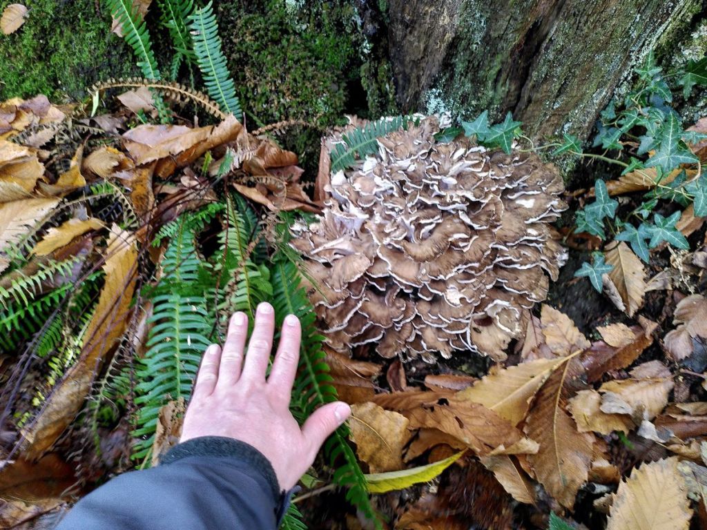 The walk began from our hotel, passing through a slither of ancient woodland that had been planted up with sweet chestnut perhaps over a century ago. I was delighted to find one of the first hen of the woods (Grifola frondosa) that I’d seen for several years. Also – how chivalrous am I!