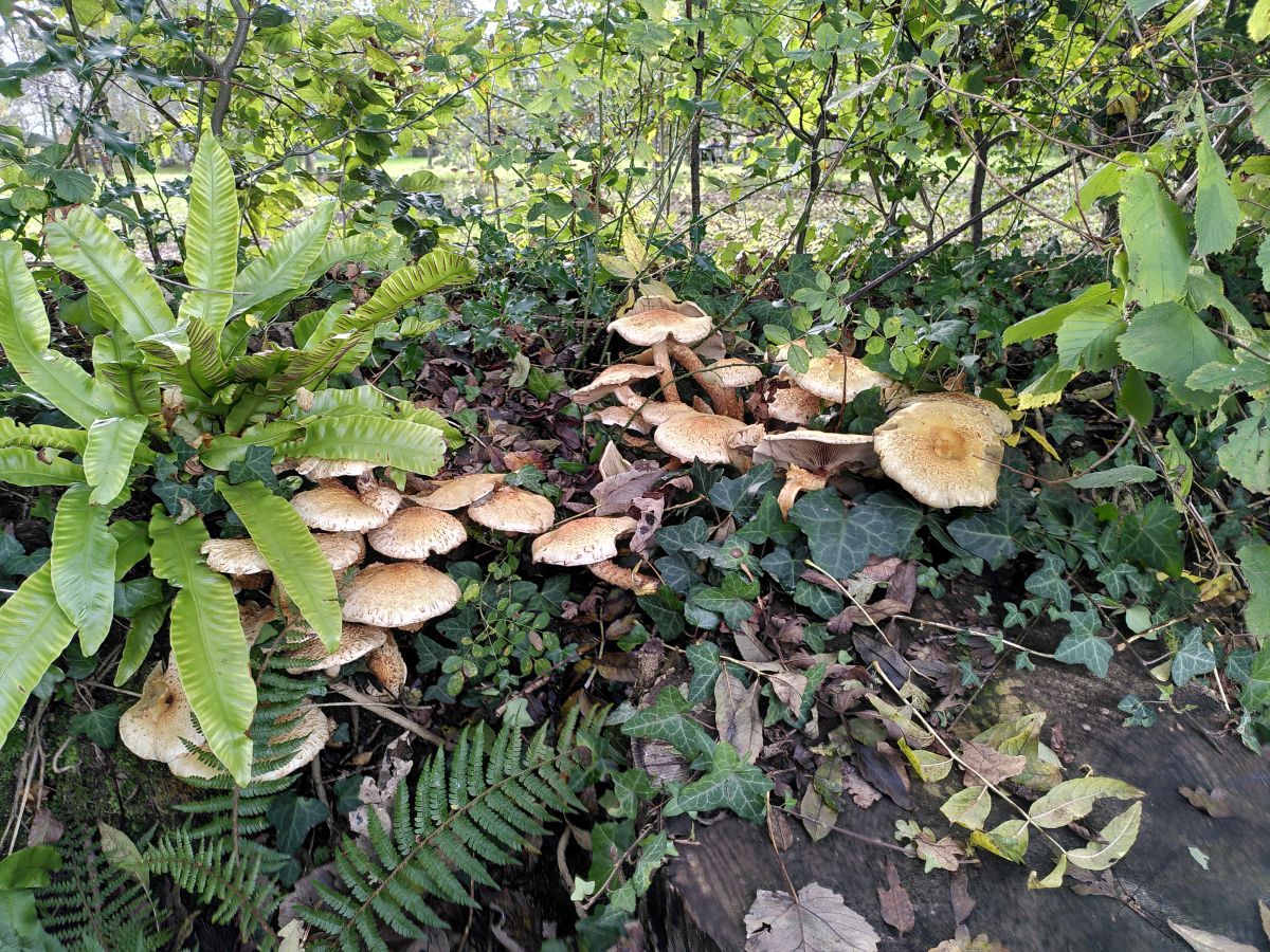 Honey fungus (Armillaria) has had quite a late start to the year in southern England. I have found it in this particular churchyard before. I think this cluster were growing where the roots of a tree once were.