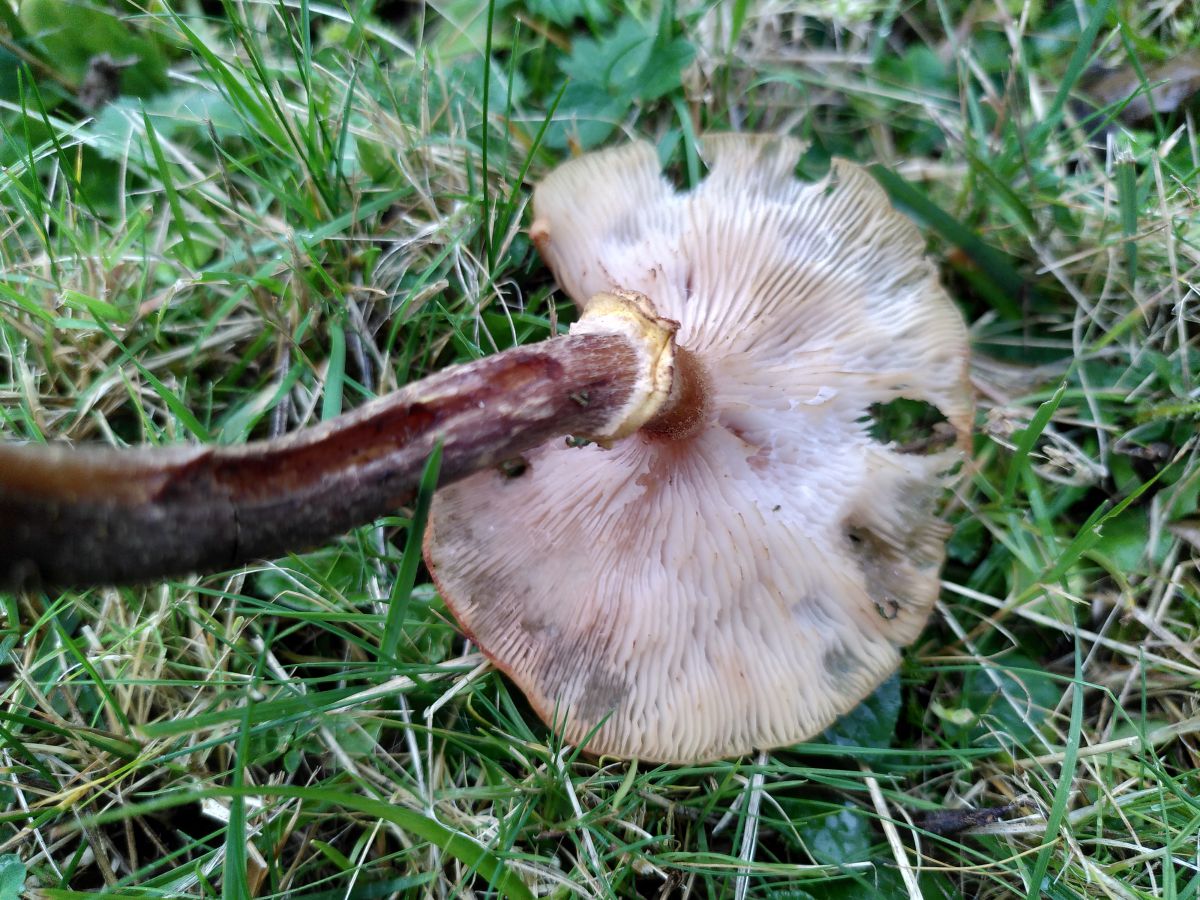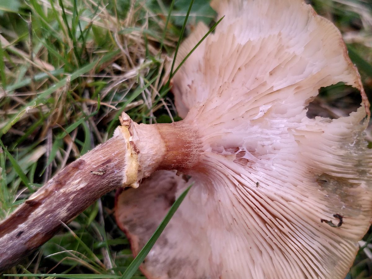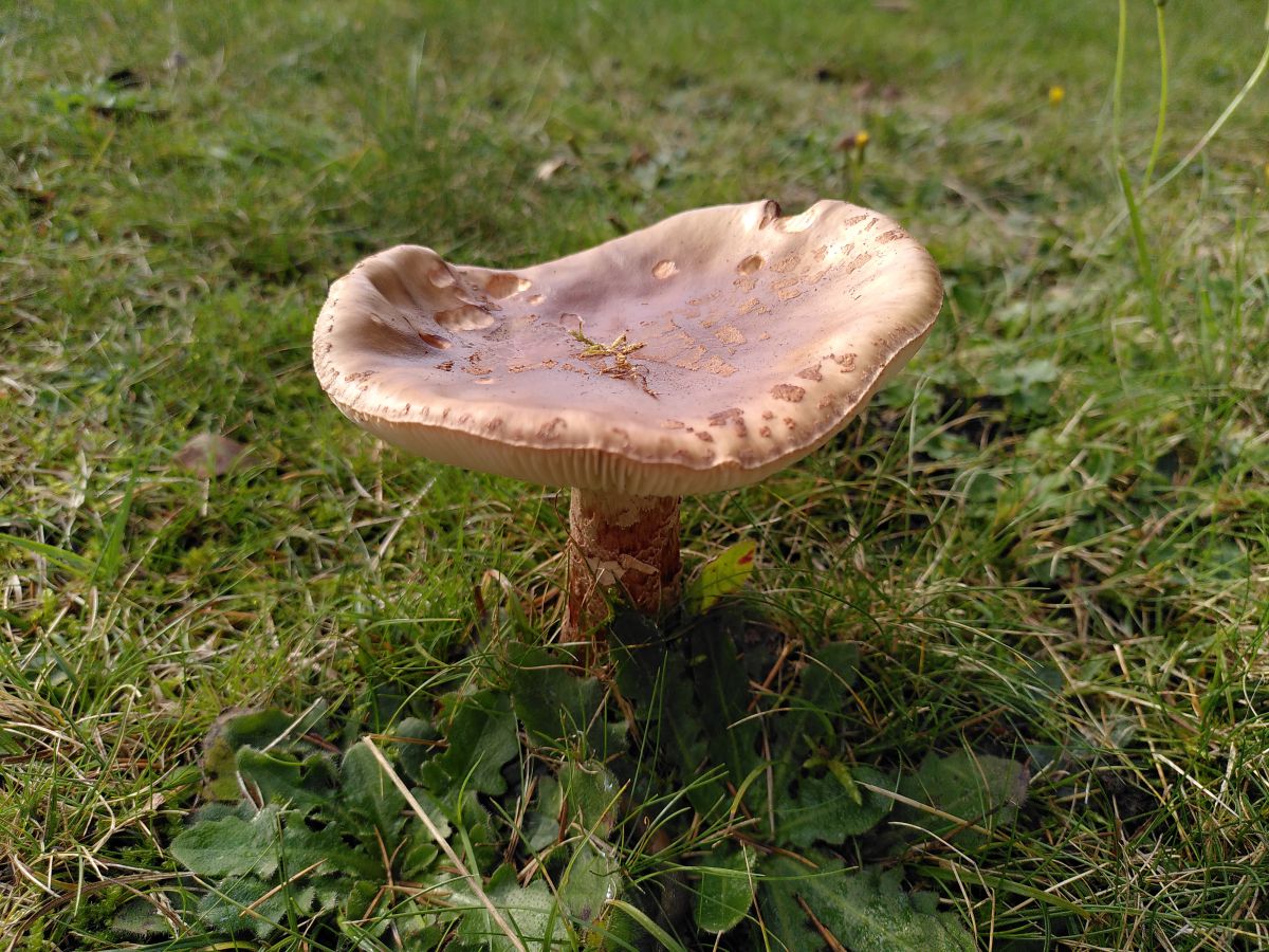 When I see a mushroom like this, I usually say to myself ‘macrolepiota‘, and leave it at that. It looks like a parasol relative of some kind.