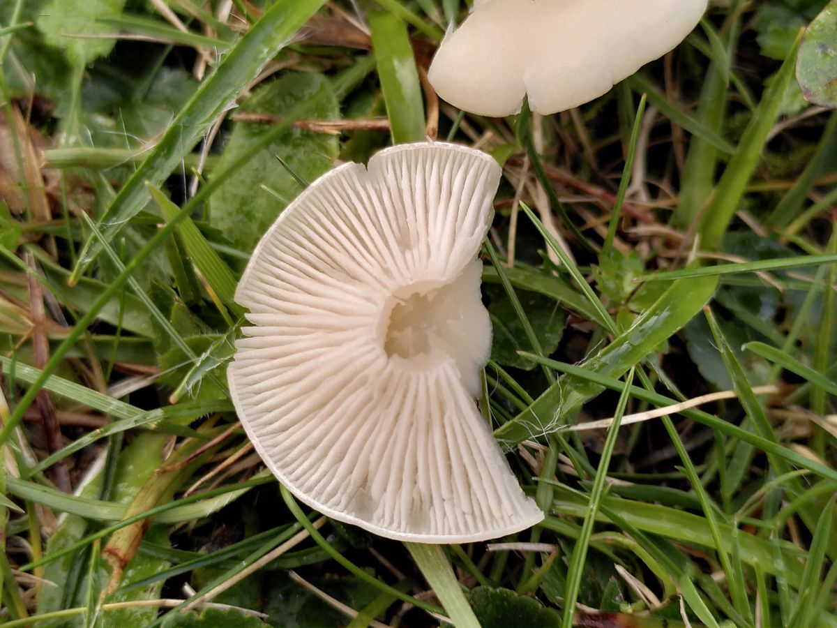 Churchyards are good places to find waxcaps, a family of mushrooms that are mainly found in ancient, unimproved grasslands. This means the grasslands haven’t been ploughed up or fertilised, hence why sacred sites like churchyards are good for them. I found a gathering of small yellow waxcaps which have been identified on iNaturalist as butter waxcap (Hygrocybe ceracea). I love the gills of waxcaps, and the phone camera does do them some justice.