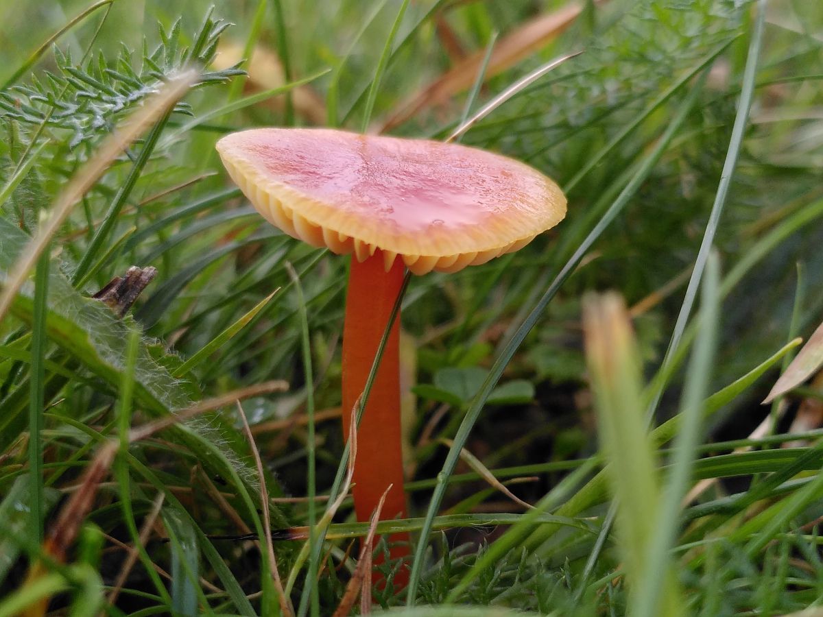 This is one of the red waxcaps, but I’m unsure if it’s honey waxcap or not. It looks too orange for scarlet waxcap.