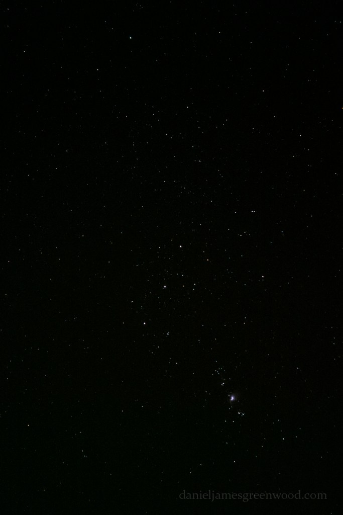 Cropping a bit closer you can see the fierce glow of the Orion Nebula in the bottom right-hand part of the image: