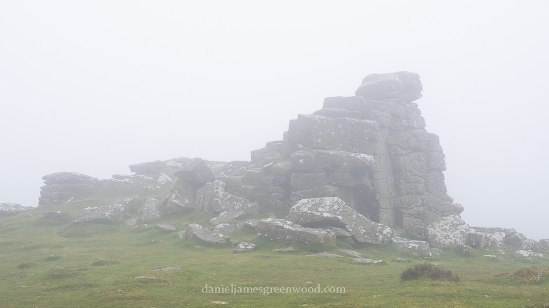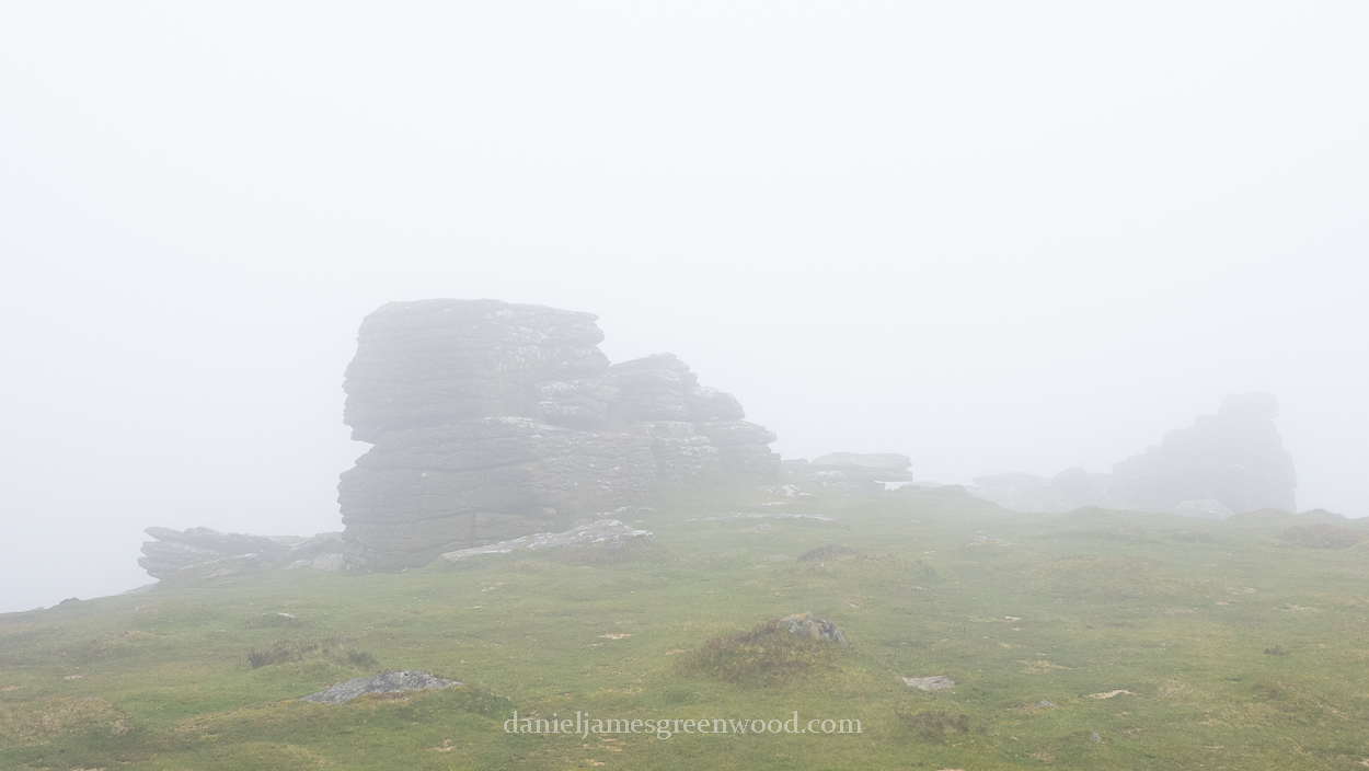 After a short plateau in the moor we crossed a quiet road and ascended Hookney Tor. Here the mist came in from the north, sucking up the wider moor, and the long stone wall that framed views in that direction. We switched east to pick up the unsigned Two Moors Way and walked between the rocky eruptions of Hookney Tor.