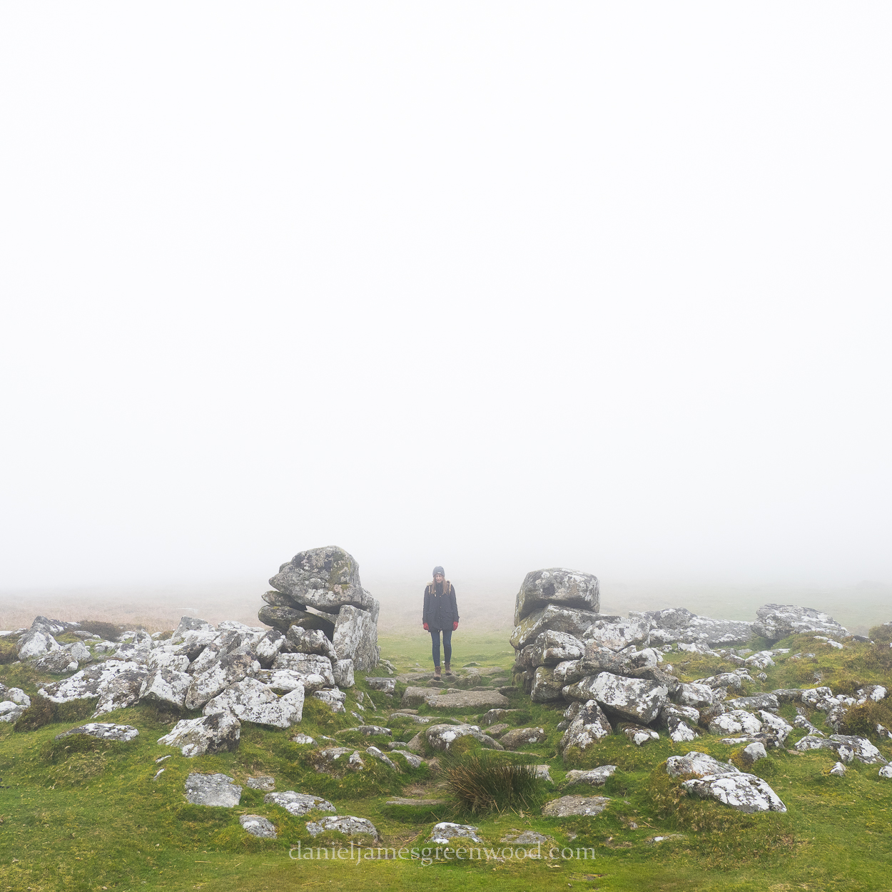 Approaching, only the collapsed stones of the outer enclosure were visible, painted white by the crust lichens that thrive on Dartmoor stone. In the distance we could hear the voices of other visitors to this ancient place. A family were visiting, posing for photos inside one of the small enclosures that had been rebuilt.
