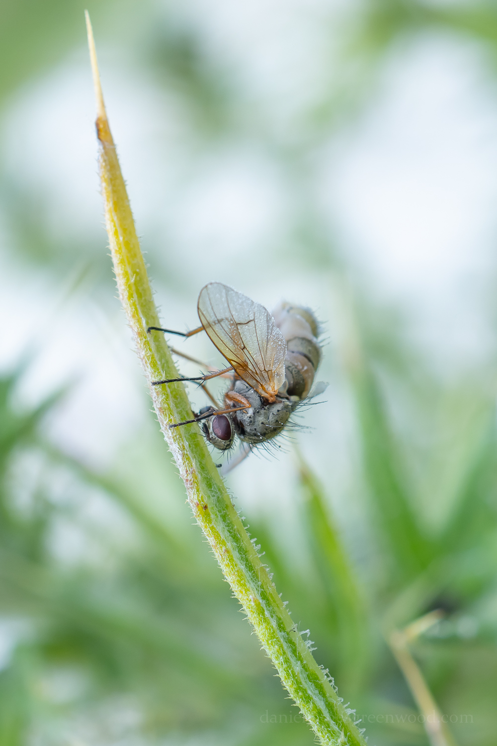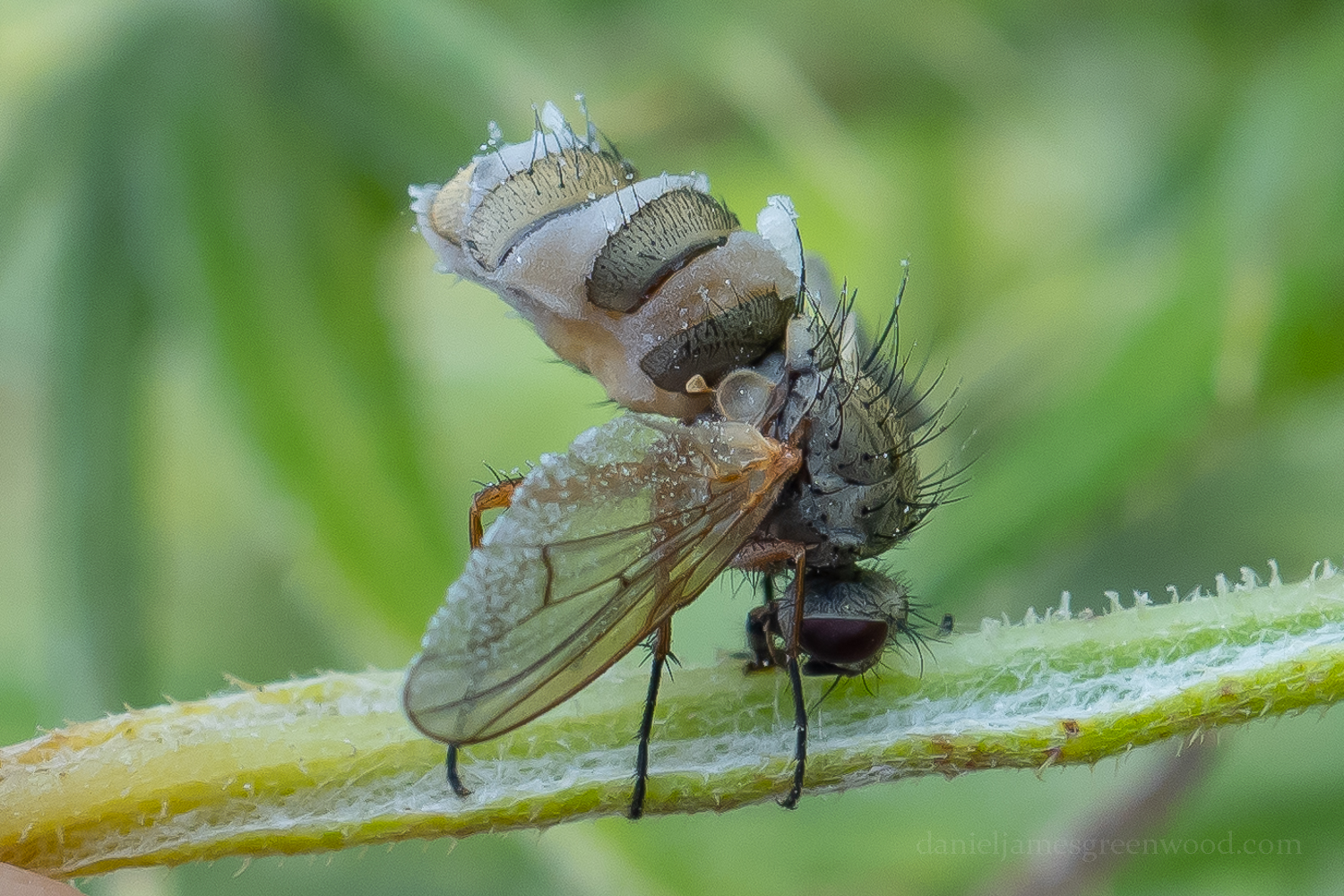 What is this exactly? It’s a fly that has been parasitised by a fungus called Entomophthora. It basically is able to control the movement of the fly by making it move to a prominent position for its final moments, or at least I think that’s what’s happening.