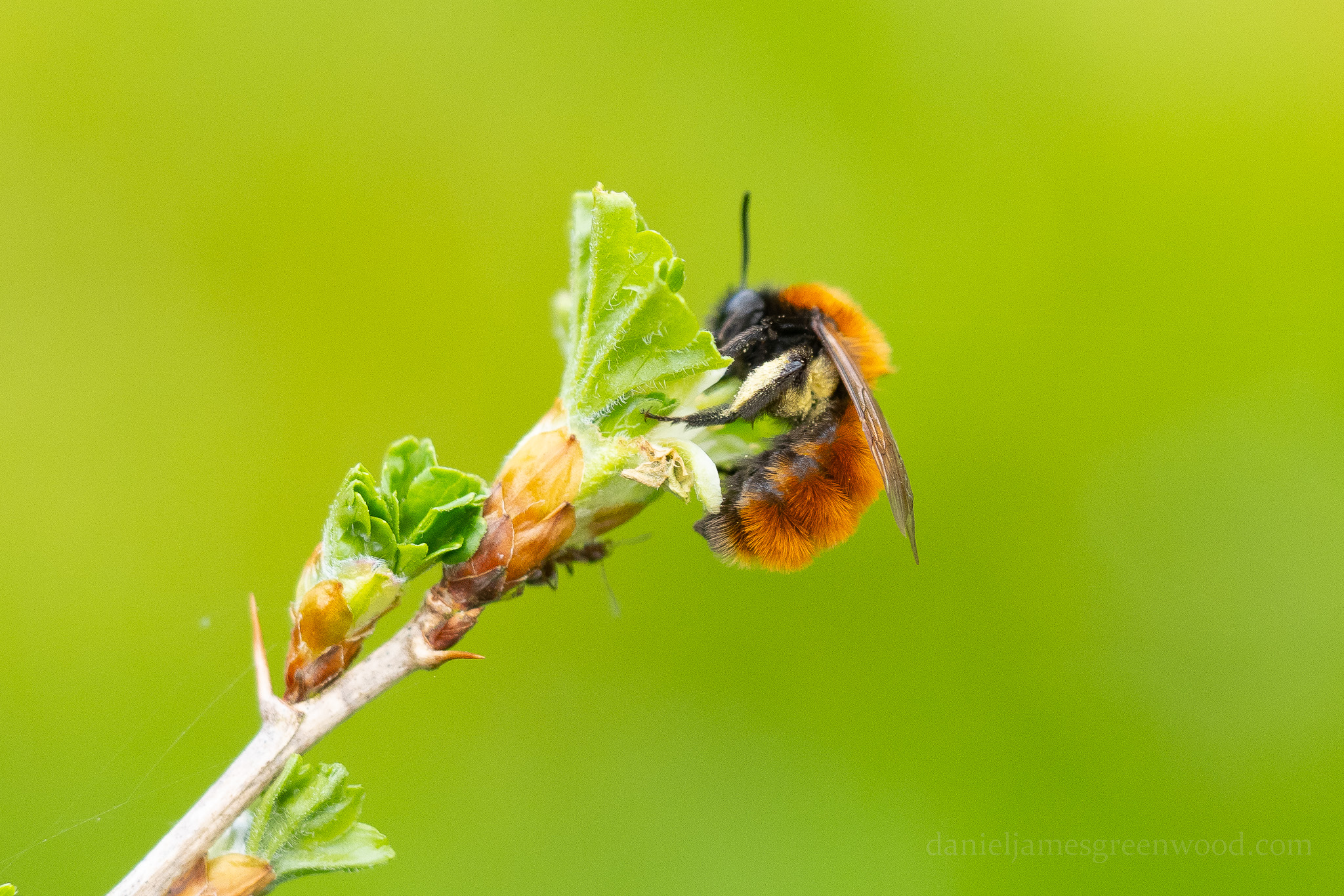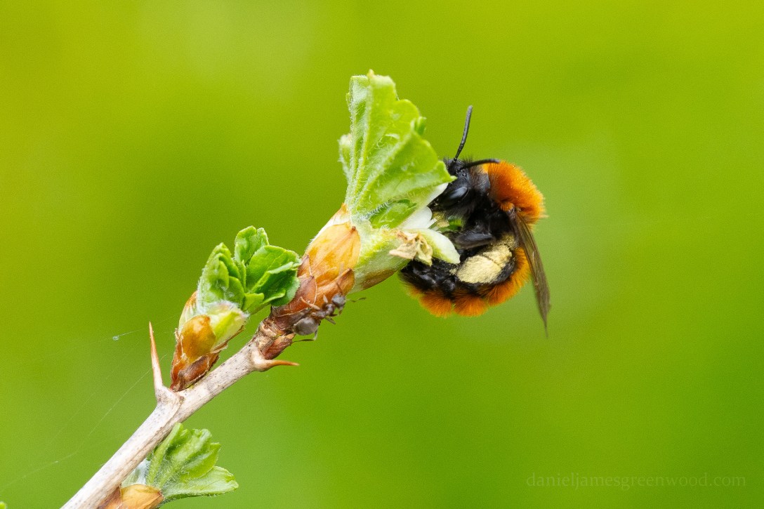 I noticed a familiar bee whizzing around the gooseberry bush – another of my Dad’s favourites, which he would pick fruit from and put into desserts, but also curse the woodpigeons who sometimes ate all the crop in one go! This little red bee is a tawny mining bee, one of the early solitary bee species that we get in southern England. Here you can see it pollinating the gooseberry flowers, that highly valuable ecosystem service you may have heard about. Also note the ant approaching!