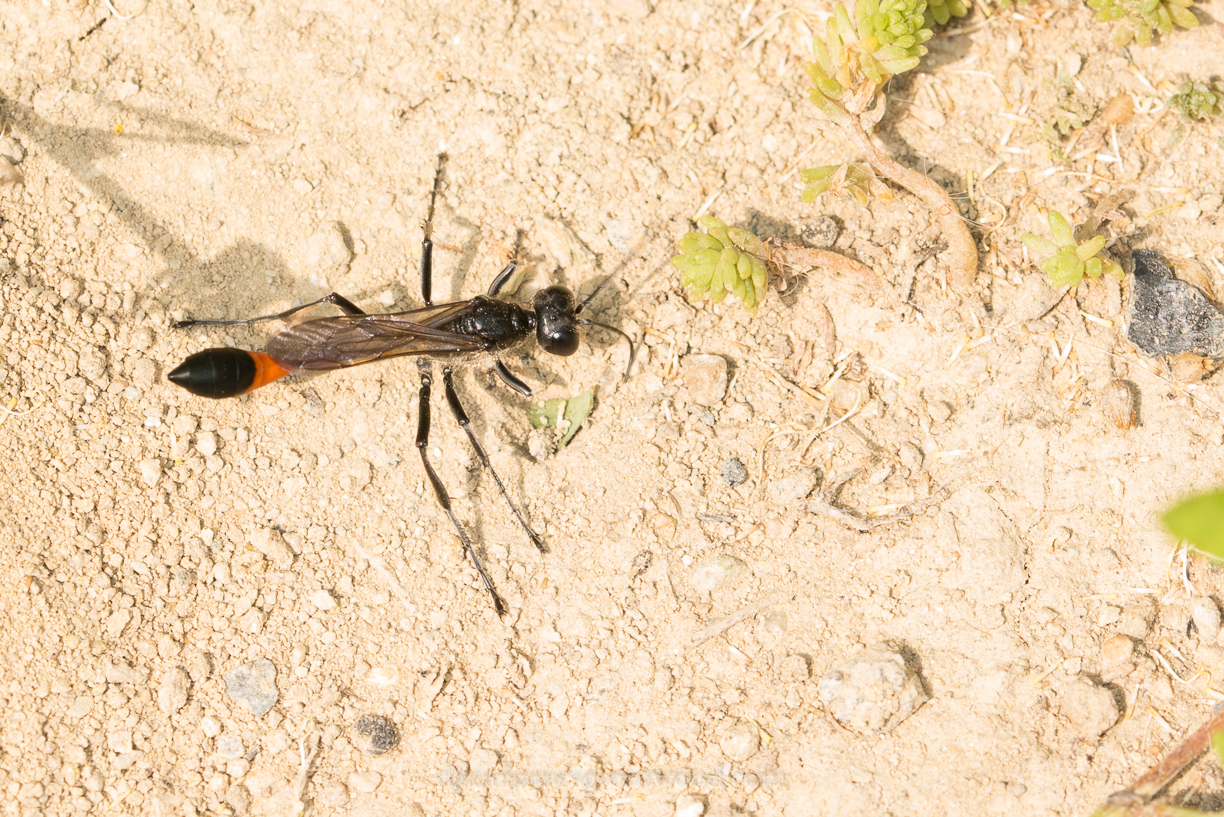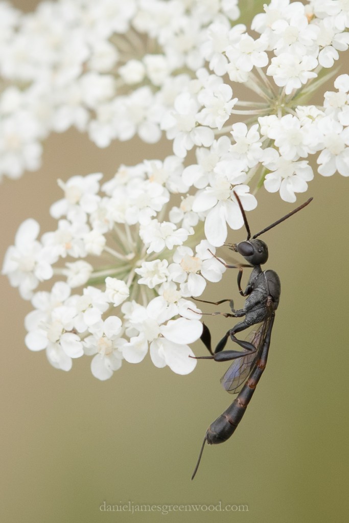 Another species of wasp, but instead an ichneumon (probably a Gasteruption species) was foraging on the flowers.