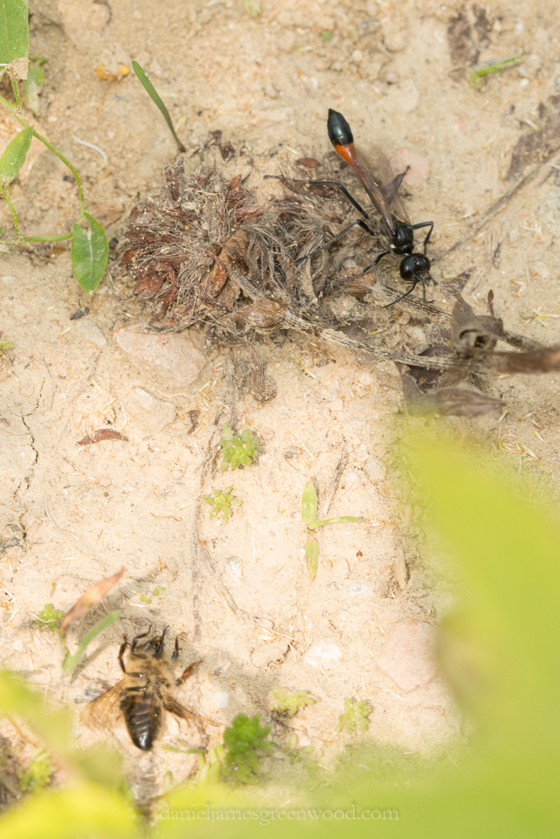 The wasp action didn’t end there. A red sand wasp had burrows in the soil. I’ve mainly seen this type of wasp on heathlands in the UK. They’re rare because of their dependence on a single habitat type, one of which, in heathlands, has seen a lot lost to forestry and development in the UK.