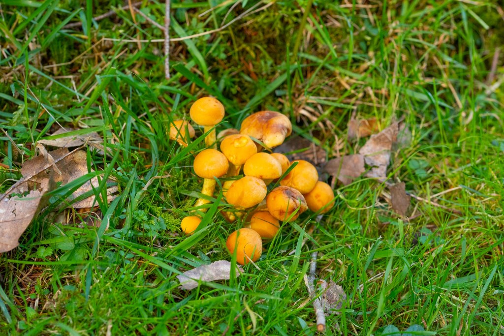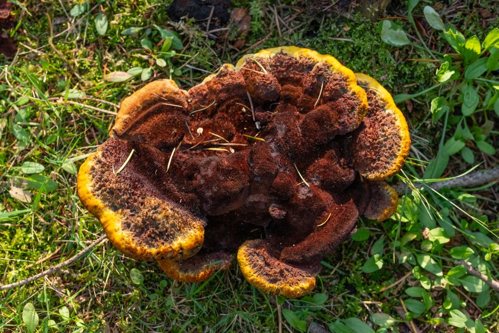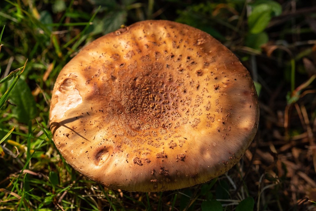About half a mile or less away we found this beauty sitting alone among the grass and leaf litter. It’s an orange bolete. It doesn’t appear to have a distinct association with one species of tree, but this area was common in oak and birch.